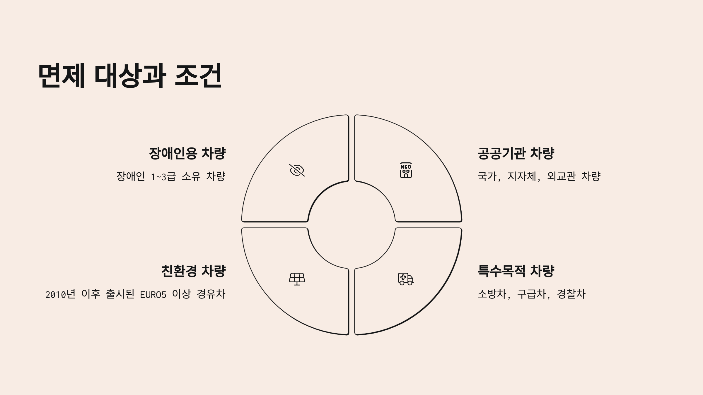 또한 일정한 조건을 갖춘 저소득층 차량이나 노후 경유차 조기 폐차 등록 차량도 면제 가능해요.