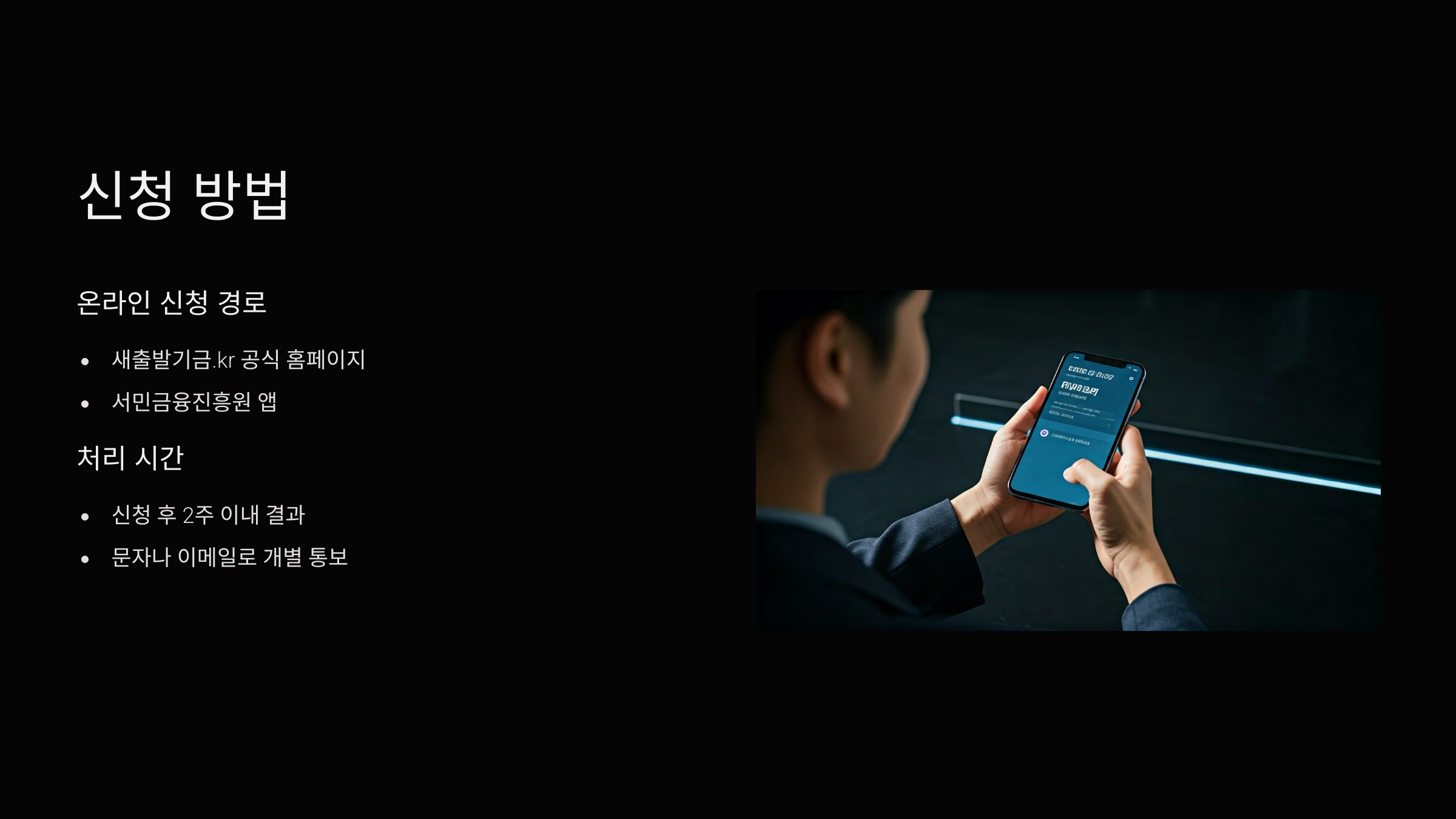 서민금융진흥원 앱이나 공식 온라인 플랫폼을 통해 신청할 수 있으며, 모든 과정은 온라인으로 처리됩니다.