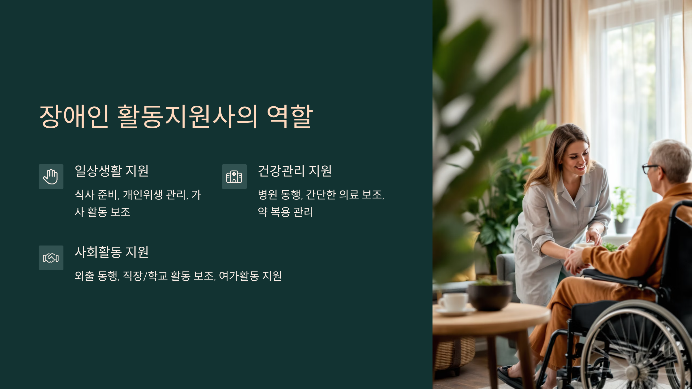 이들은 단순한 돌봄을 넘어, 장애인의 자립 생활을 실질적으로 지원하는 중요한 역할을 맡고 있어요.