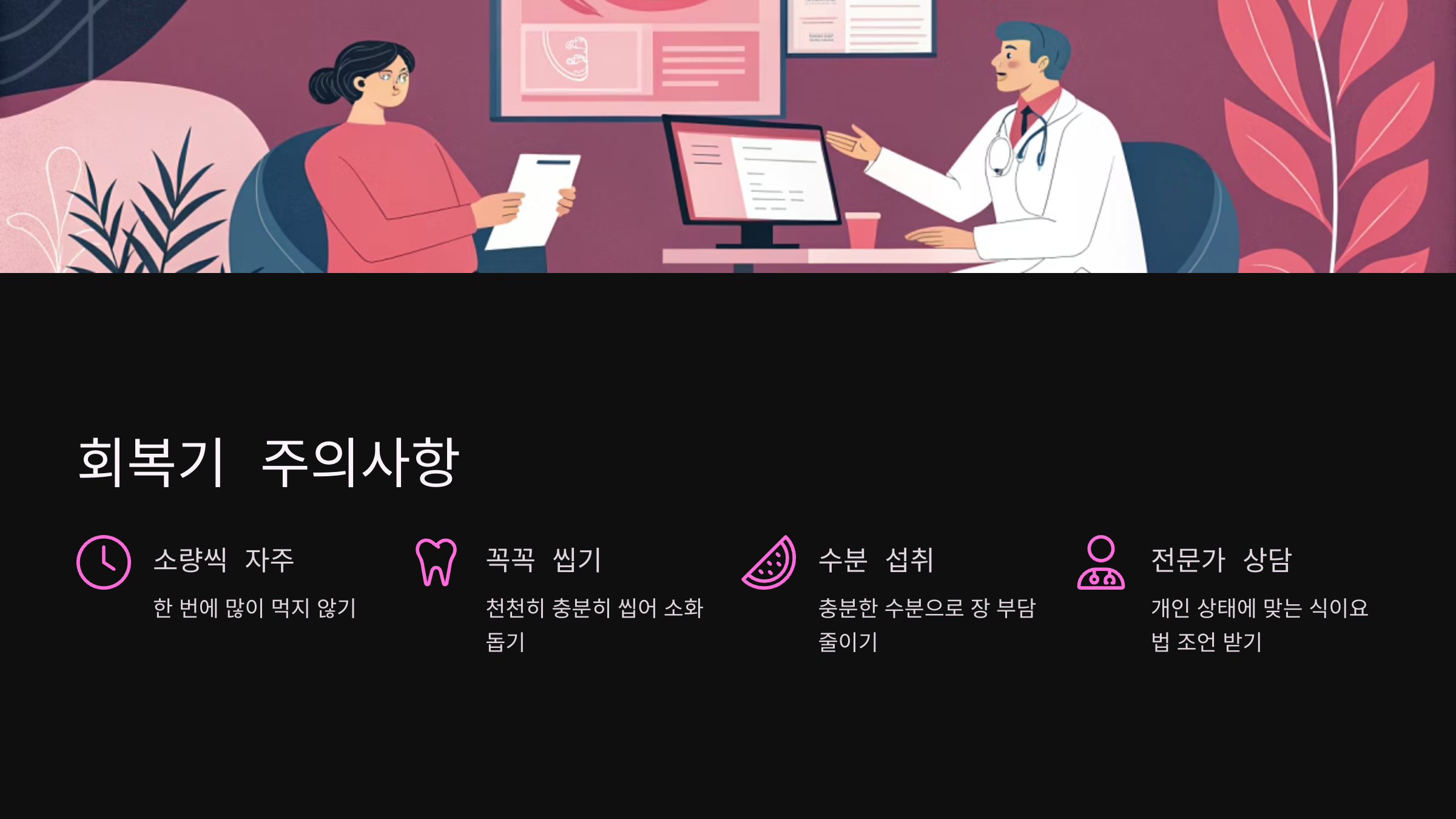 소량씩 자주, 꼭꼭 씹어 먹는 습관이 중요하고, 부드럽고 섬유소가 적은 음식 위주로 섭취하는 게 좋아요.