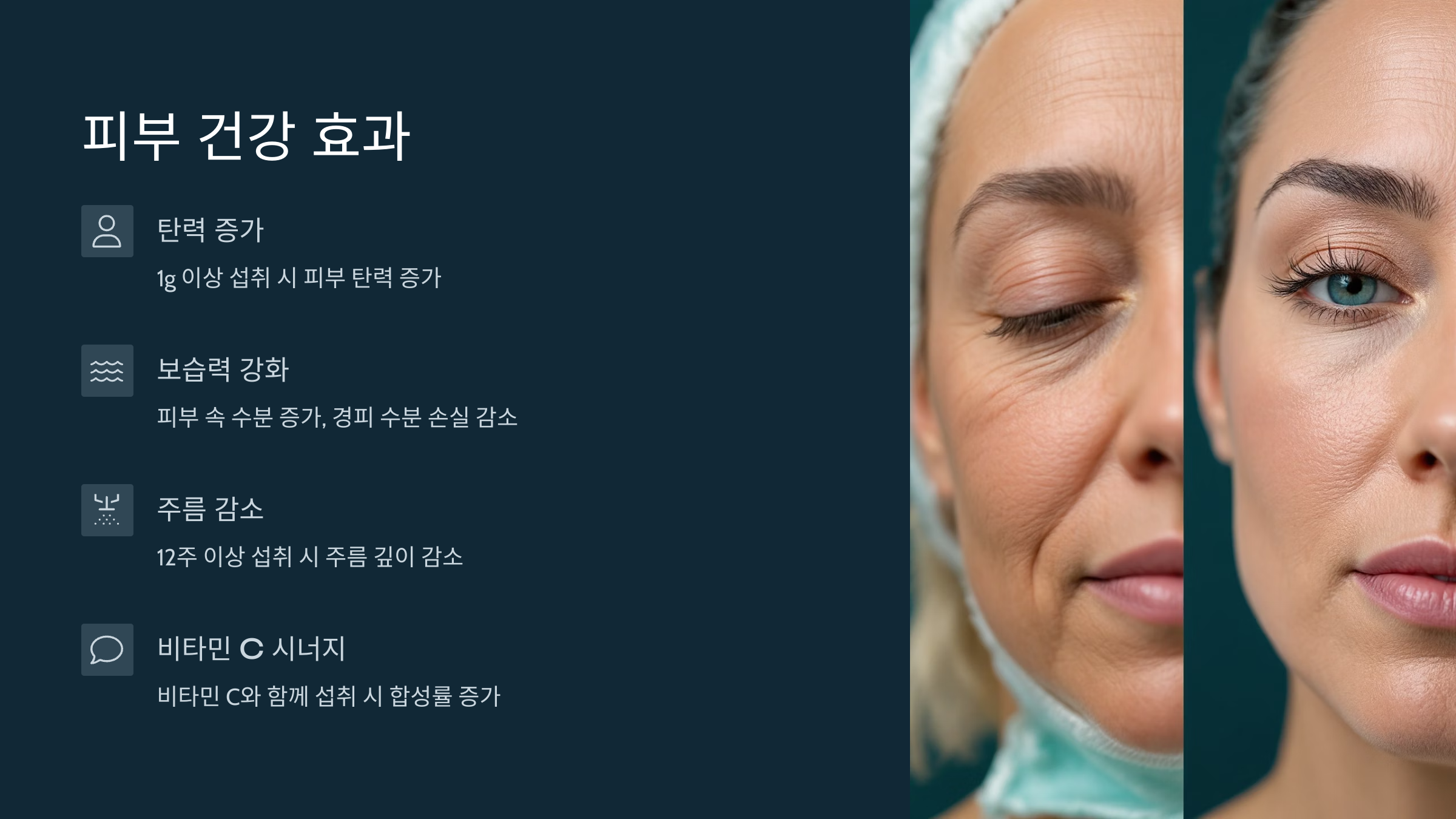 1g 이상 섭취 시 피부 탄력 증가, 보습력 강화, 주름 감소 등의 효과가 있다는 연구 결과들이 있어요.
