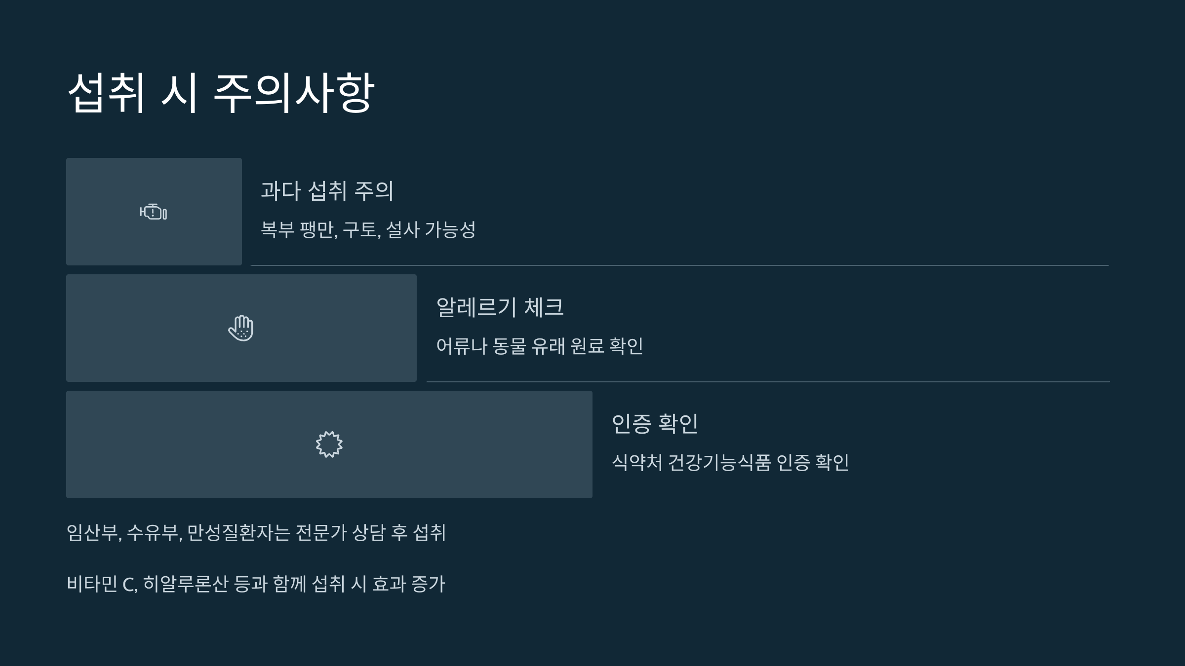 임산부, 수유부, 만성 질환을 앓고 있는 분들은 전문가 상담 후 섭취를 결정하는 것이 안전하답니다.
