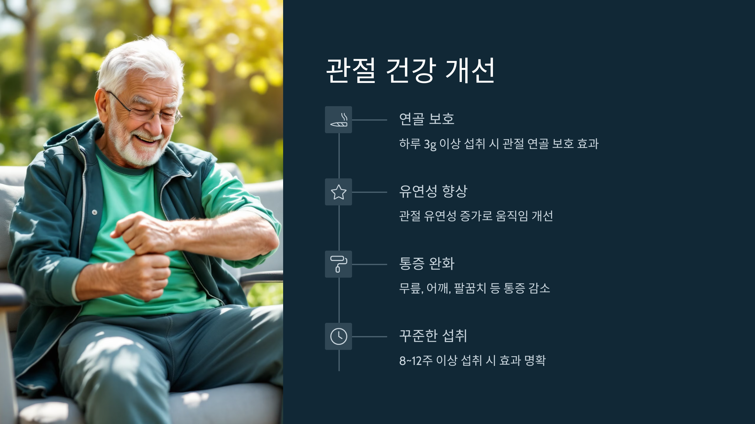 특히 하루 3g 이상 섭취 시 관절 내 연골 보호, 유연성 향상, 통증 완화에 긍정적인 효과를 나타낸다는 연구 결과가 있습니다.
