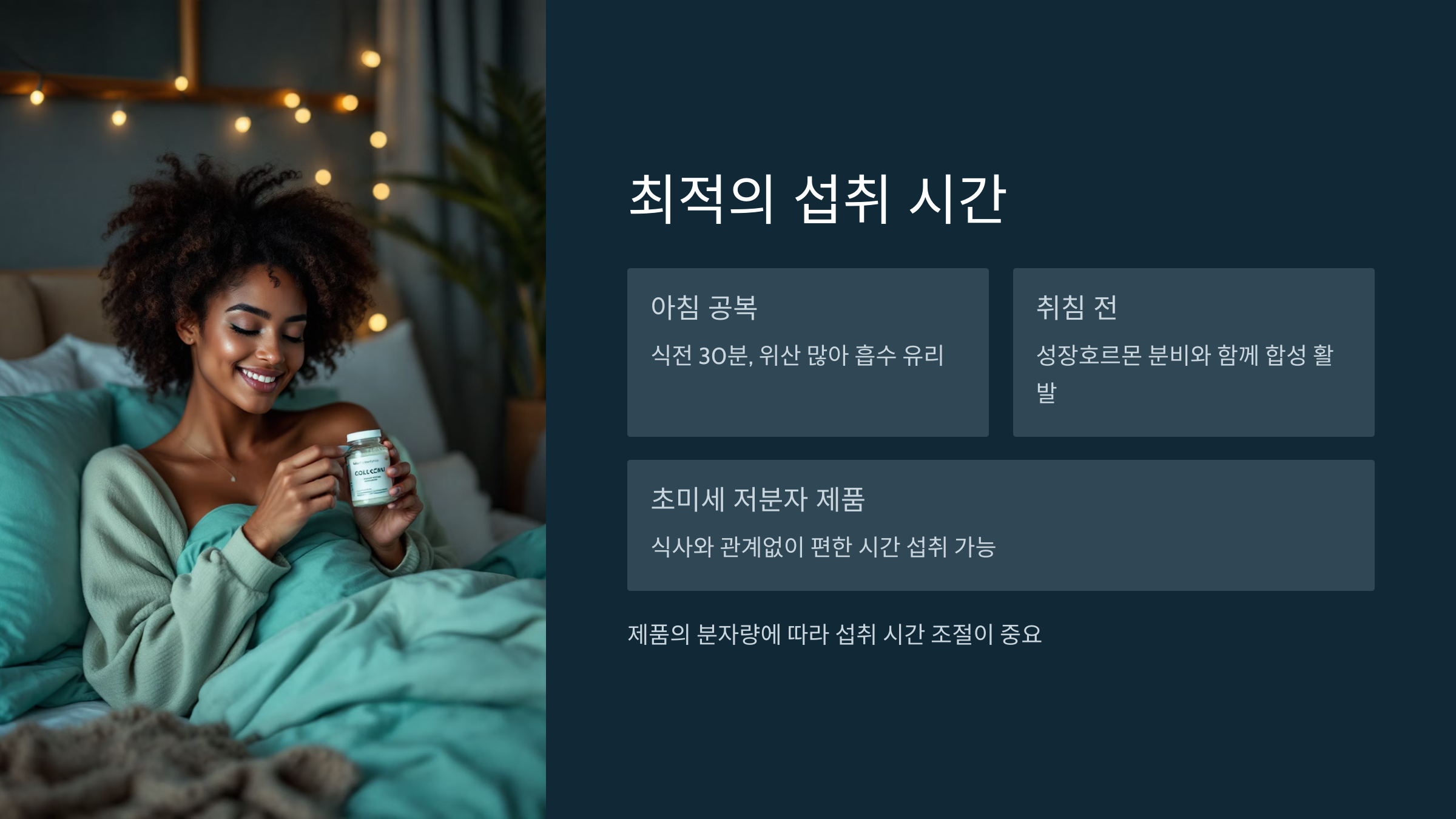 🌞 아침 공복은 위산이 많아 흡수에 유리하고, 🌙 취침 전은 재생효과를 도울 수 있어요.