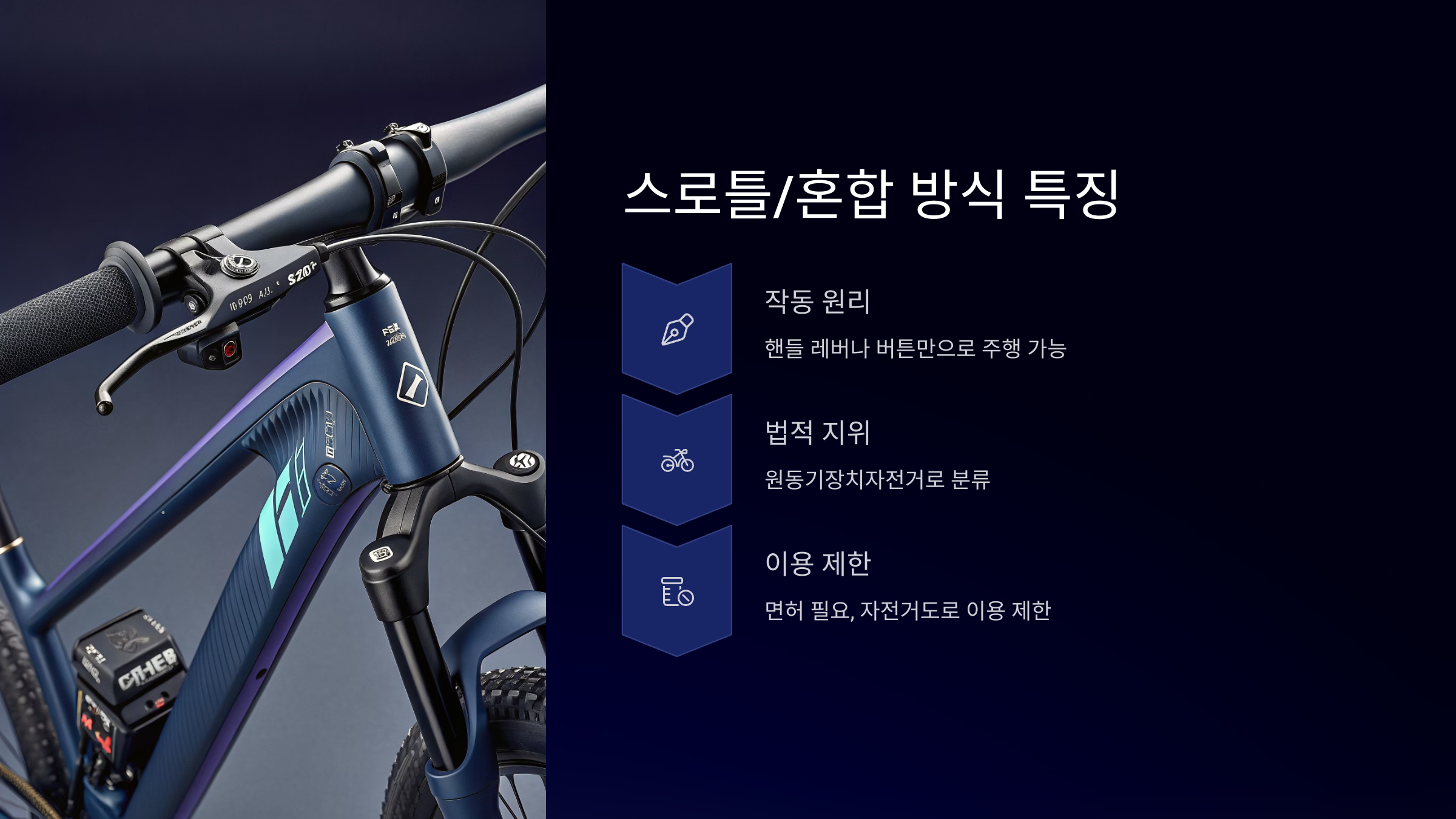 | 스로틀/혼합 방식 | 원동기 면허 필요 | 제한적 또는 불가 | 16세 이상, 면허 필요 |