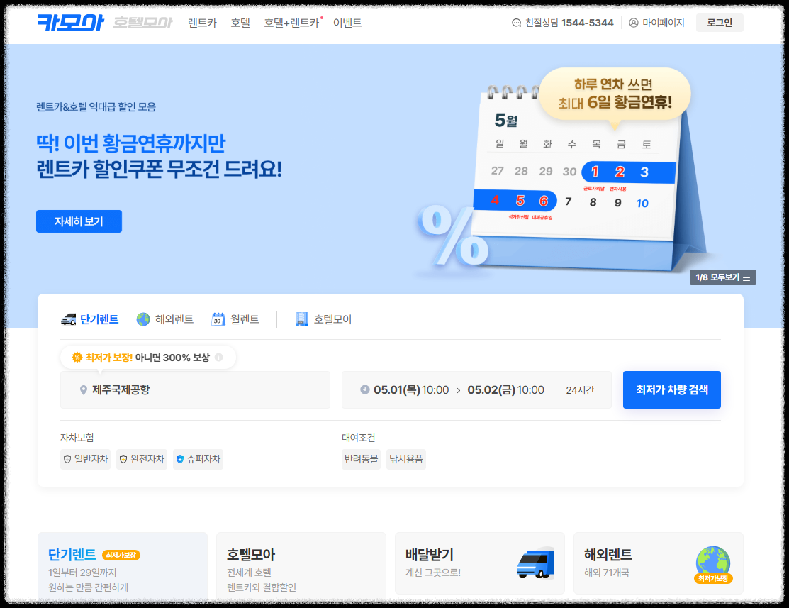 여행 일자만 입력하면 조건에 맞는 차량을 자동으로 매칭해주고, 할인쿠폰이나 프로모션도 자주 제공돼요.