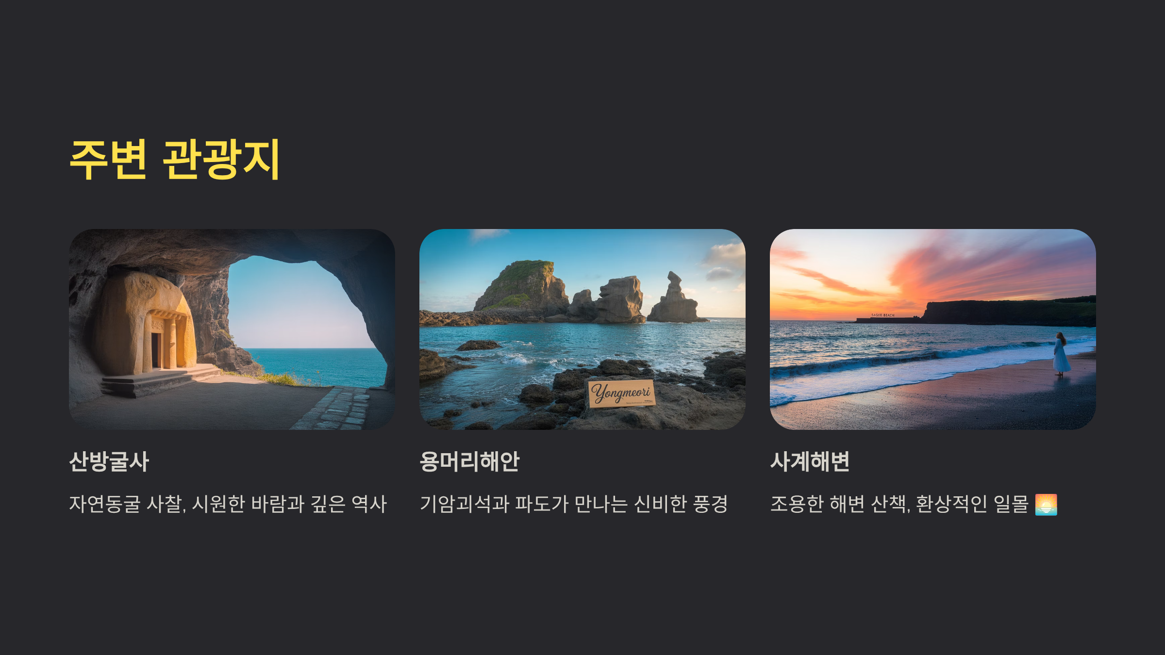 광명사 방문 후 주변 명소를 함께 둘러보면 여행 만족도가 확 올라가요! 이 근처에는 제주 특유의 자연 풍경이 풍부하게 펼쳐져 있어서 힐링 코스로 딱이거든요 😊