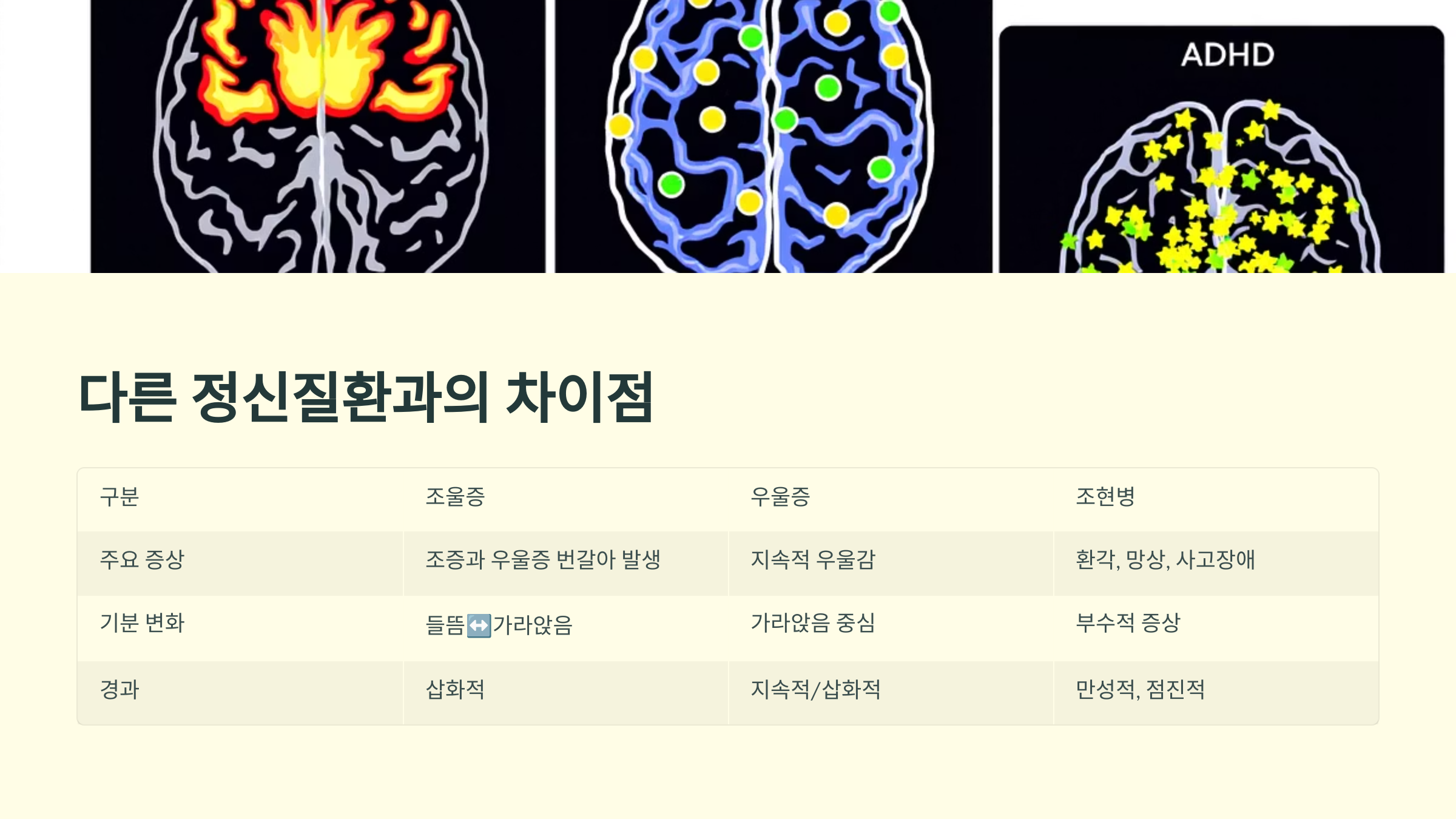 조울증은 ‘기분의 양극단 변화’, 조현병은 ‘지속적 사고장애’가 중심이라는 점이 핵심 차이입니다.