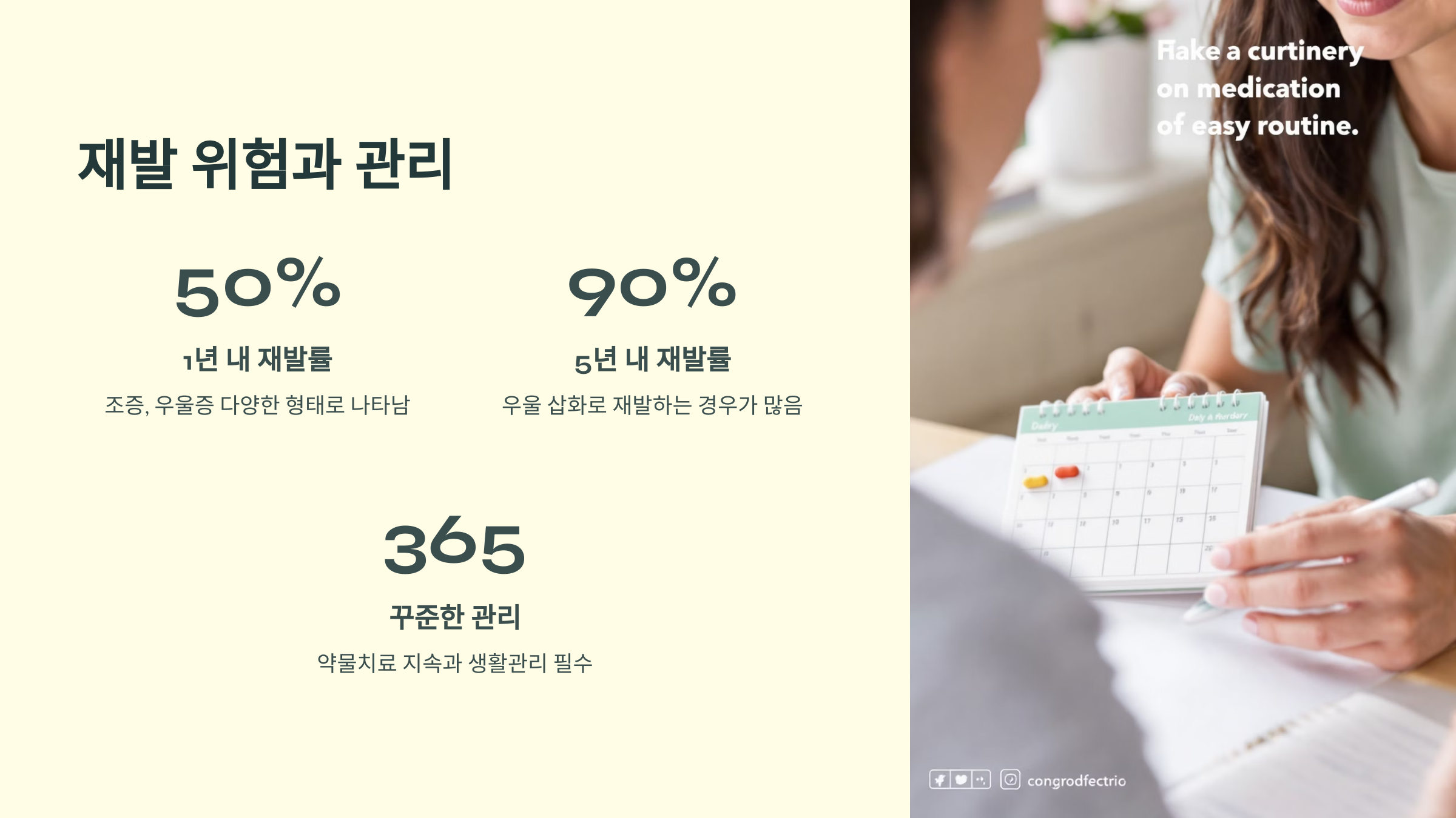 완치보다는 ‘증상 조절과 재발 예방’이 핵심이에요. 꾸준한 치료와 생활관리로 정상적인 삶이 충분히 가능합니다.