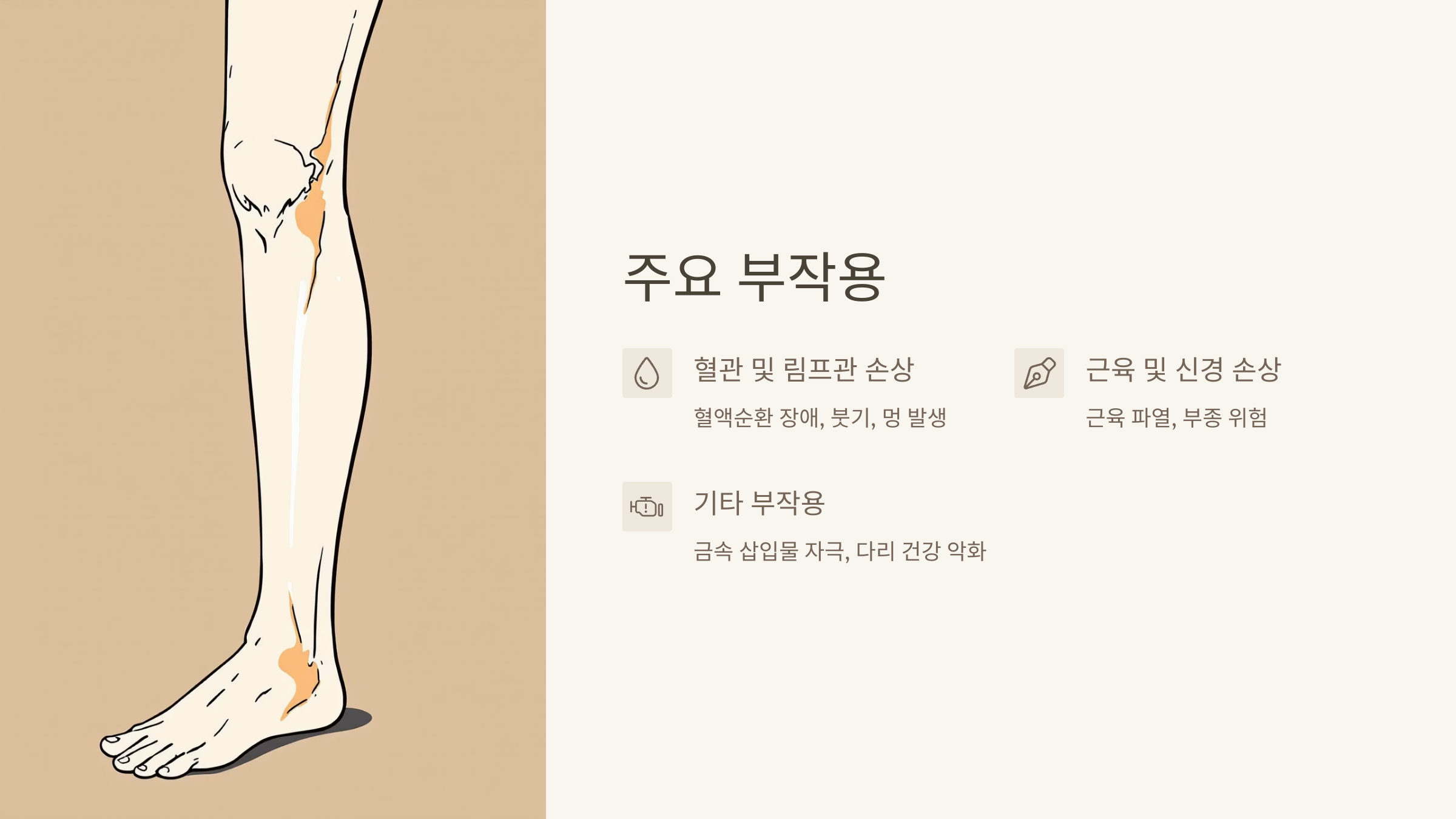 금속 핀이나 인공 삽입물이 있는 부위에 사용할 경우 문제가 생길 수 있으며, 과도한 사용은 오히려 다리 건강을 악화시킬 수 있어요.