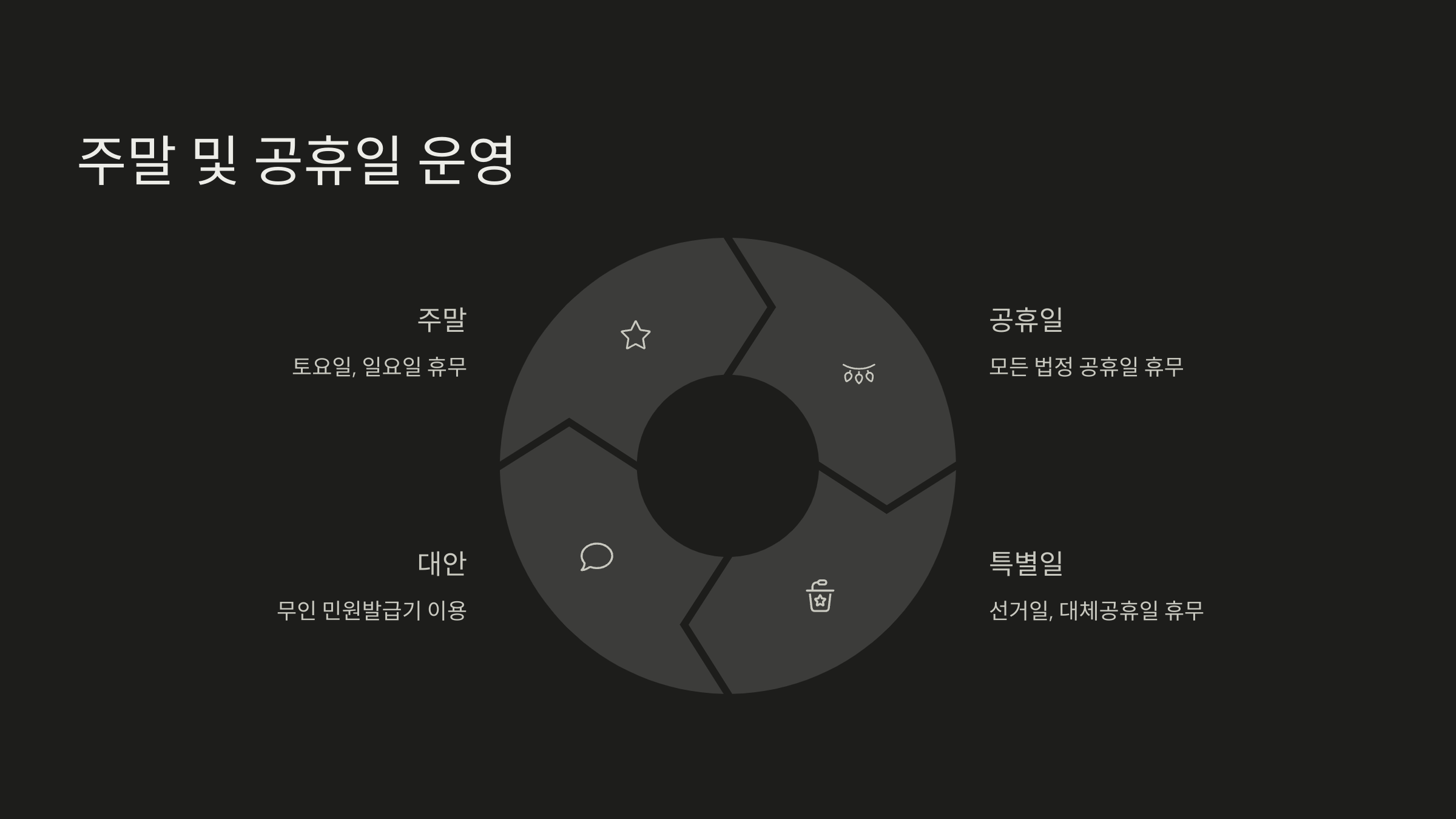 주말(토요일, 일요일)과 모든 공휴일에는 운영하지 않습니다.