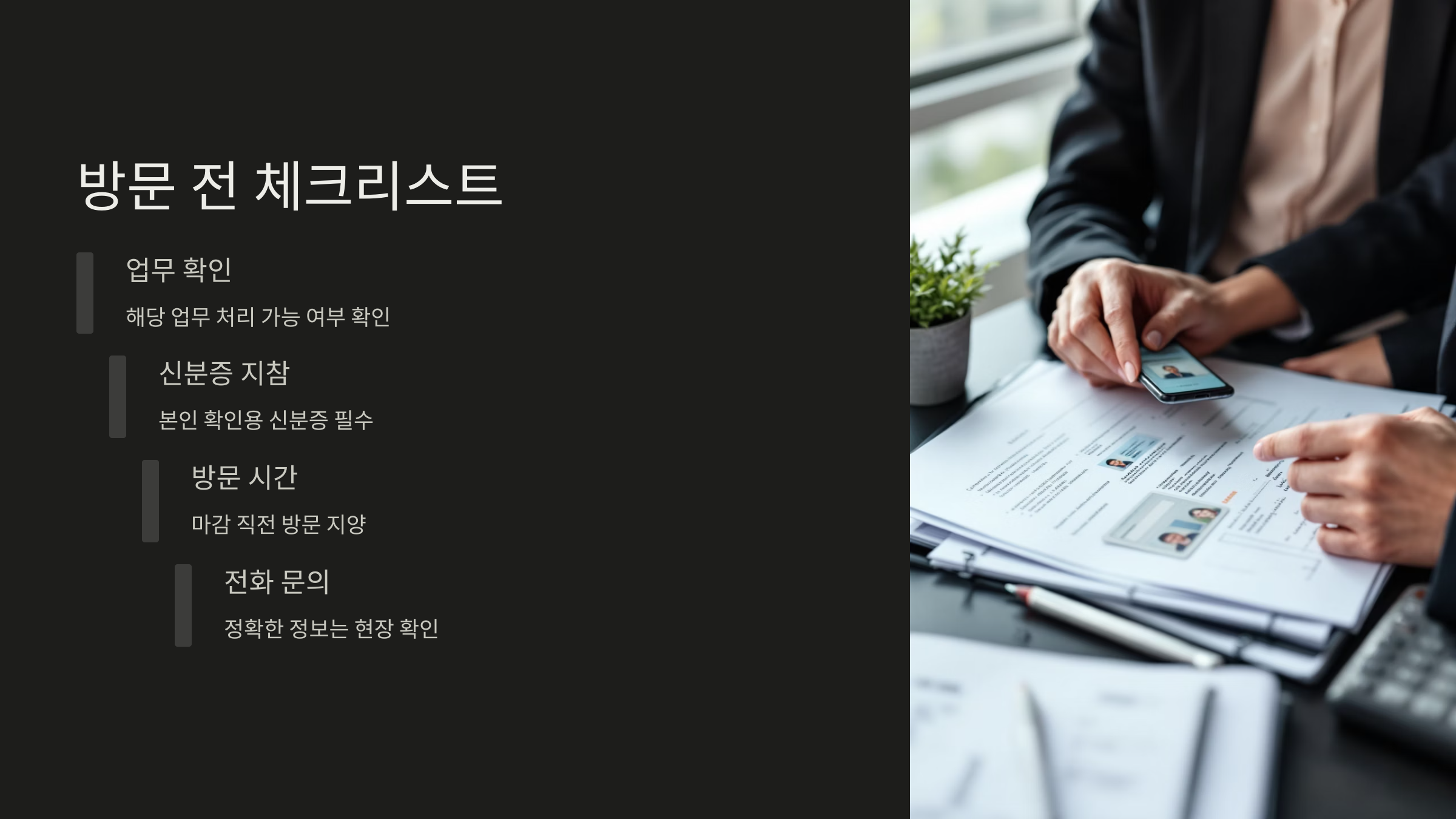 모든 민원 업무는 본인 확인이 전제이므로, 신분증을 반드시 챙겨야 해요.
