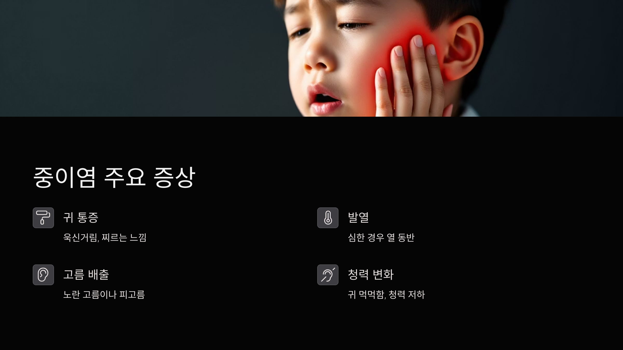 💡 TIP: 중이염 증상은 감기와 비슷하게 시작되지만, 귀에 집중된 통증과 고름, 청력 변화가 있다면 반드시 중이염을 고려해야 해요.