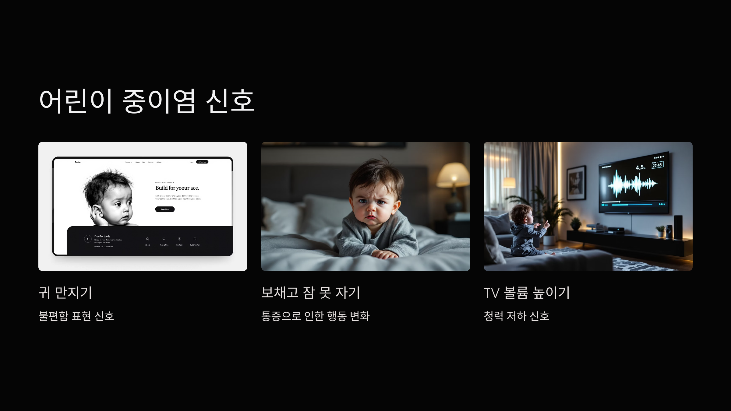 그리고 어린아이의 경우엔 스스로 통증을 말하지 못하기 때문에, 귀를 자꾸 만지거나, 보채고, 잠을 제대로 자지 못하고, 식욕이 감소하는 행동으로 나타날 수 있어요.