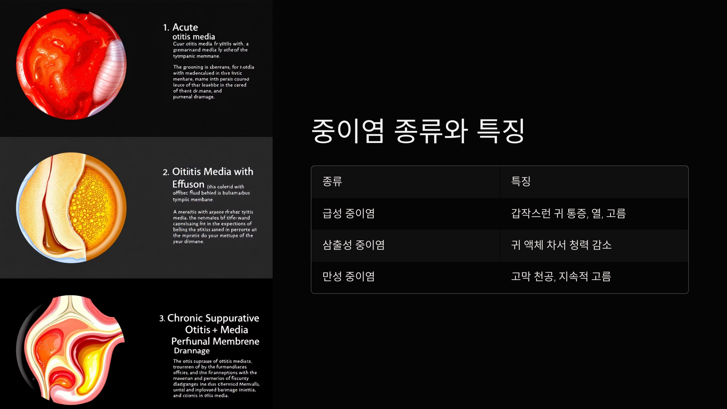 | 삼출성 중이염 | 통증은 없으나 귀에 액체가 차서 청력이 감소할 수 있으며, 튜브 삽입 등의 치료 고려 |