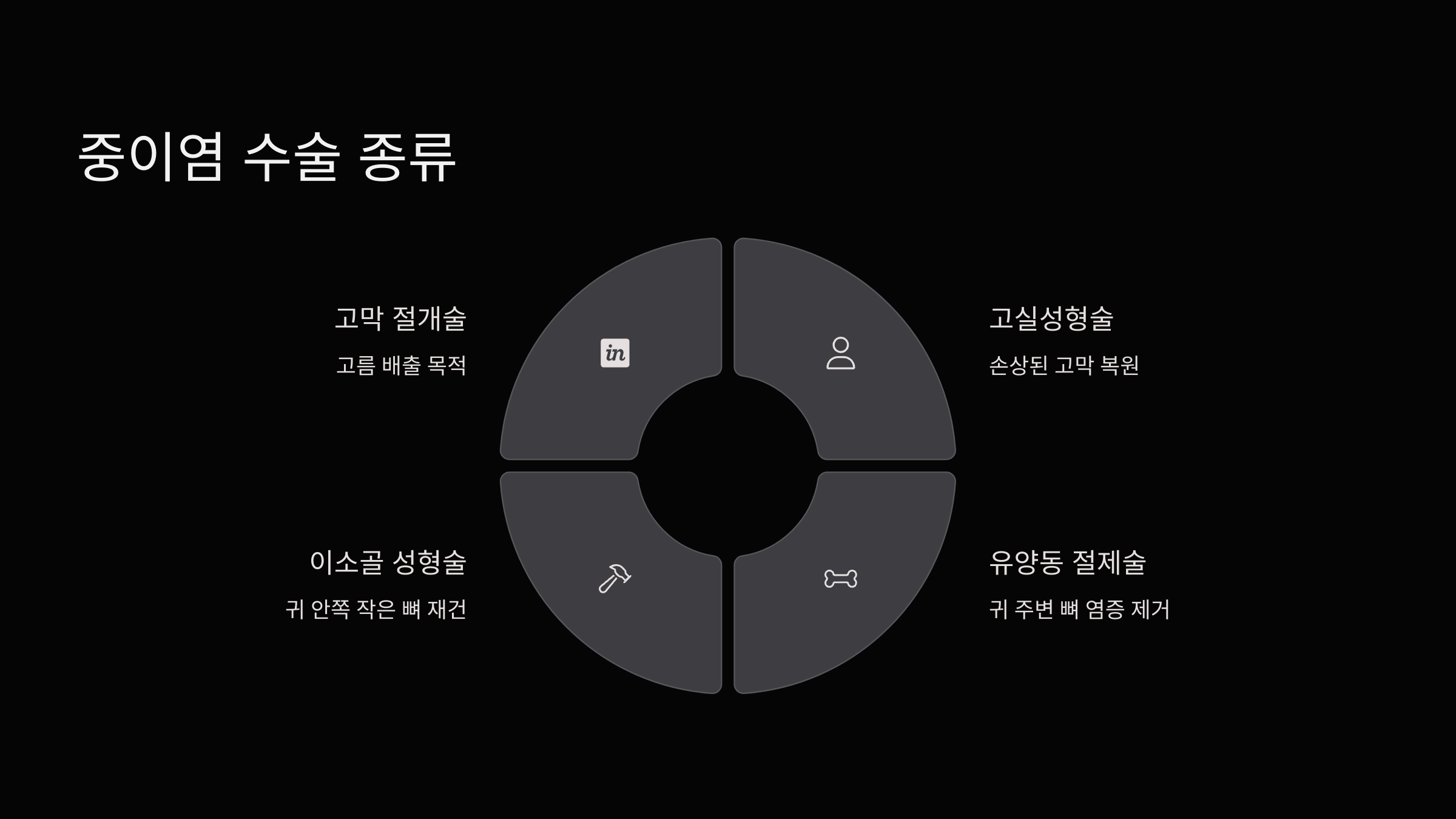 | 유양동 절제술 | 염증이 귀 주변 뼈로 번진 경우 해당 부위를 절제 |