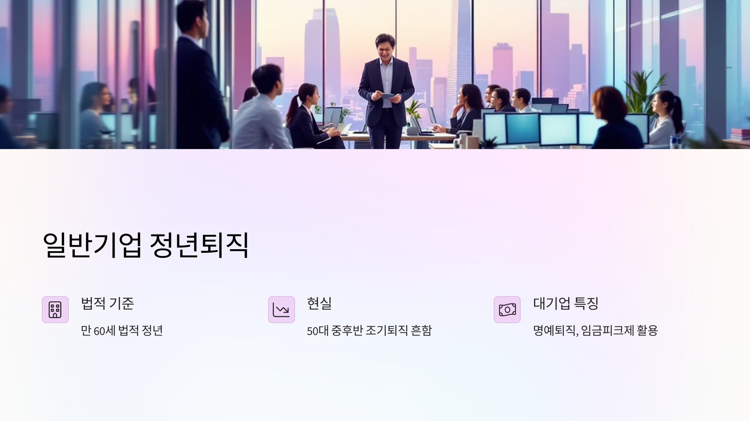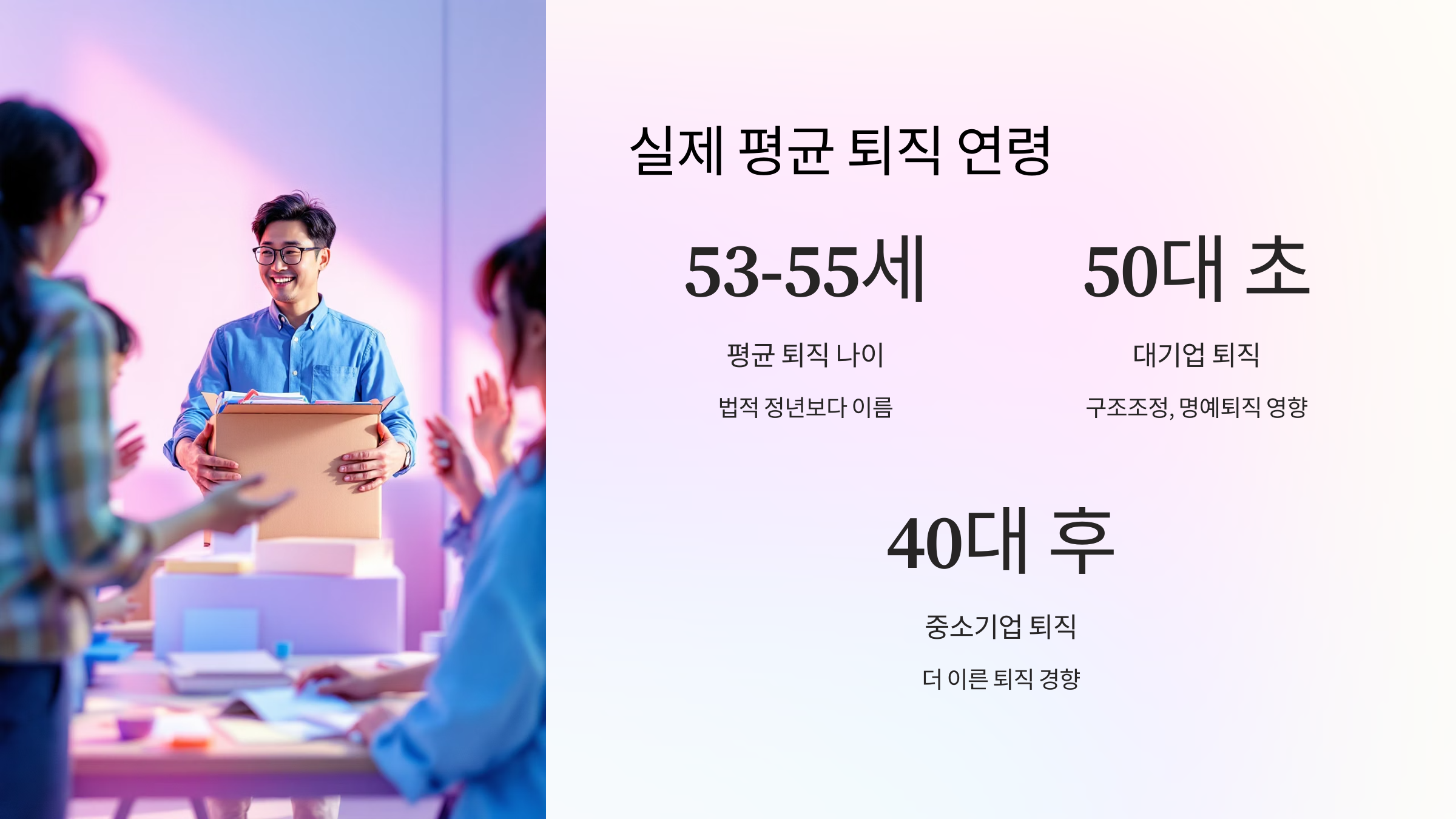 기업 구조조정, 임금 부담 감소, 경력 전환 등의 이유로 50대 초반~중반에 조기 퇴직하는 경우가 많습니다.