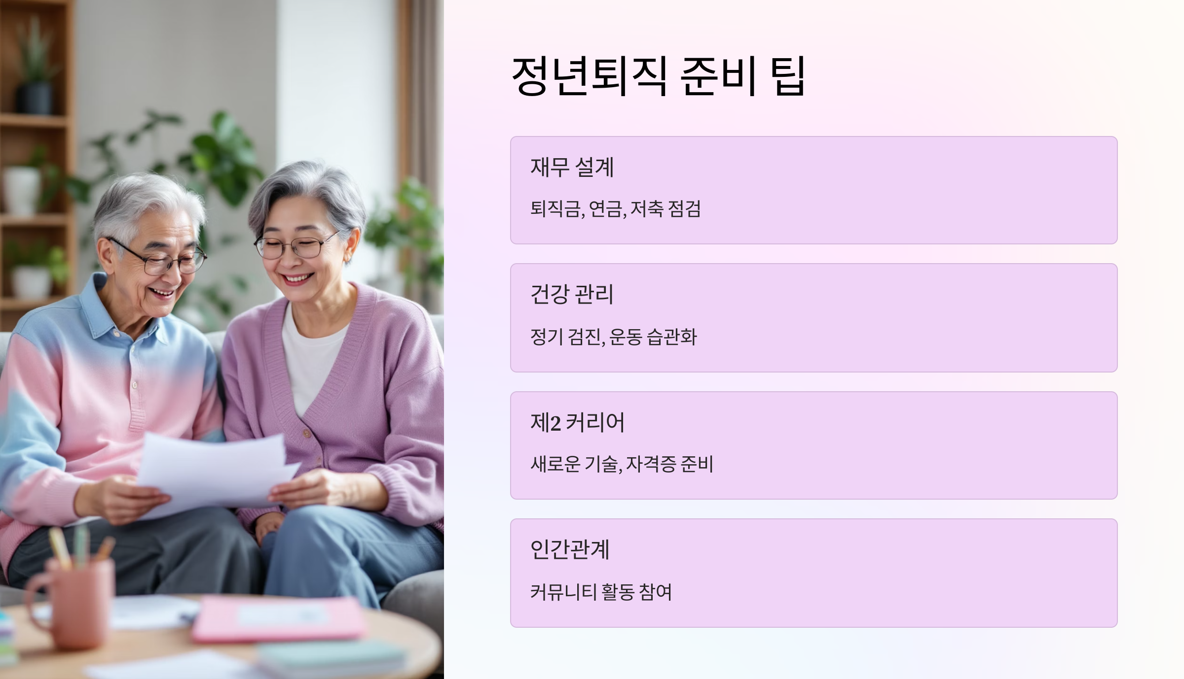 재무 설계, 건강 관리, 제2 커리어 준비가 가장 중요합니다. 특히 소득 공백을 최소화할 수 있도록 조기 준비하는 것이 좋아요!