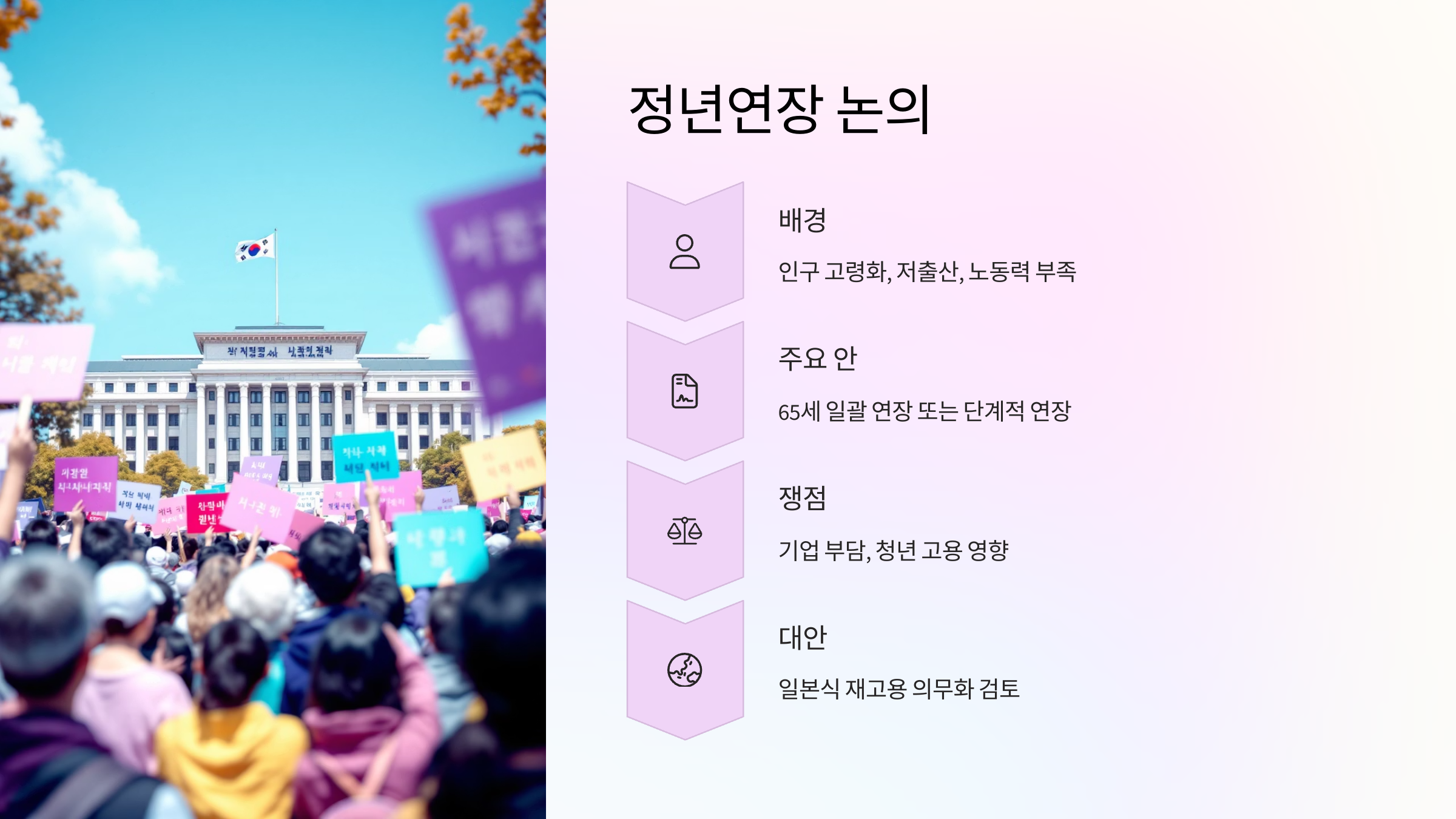 또한, 일본처럼 60세 정년 이후에도 65세까지 재고용 의무를 부여하는 방식이 대안으로 논의되고 있어요.