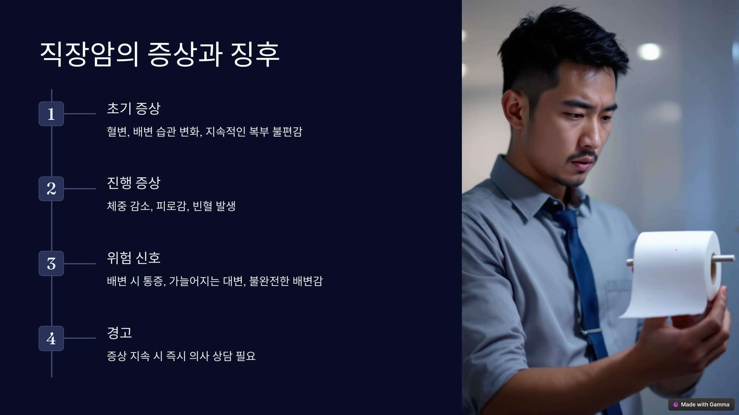 직장암은 초기에 별다른 증상이 없기 때문에 정기적인 검진이 필수적입니다. 하지만 병이 진행됨에 따라 다양한 증상이 나타날 수 있습니다.