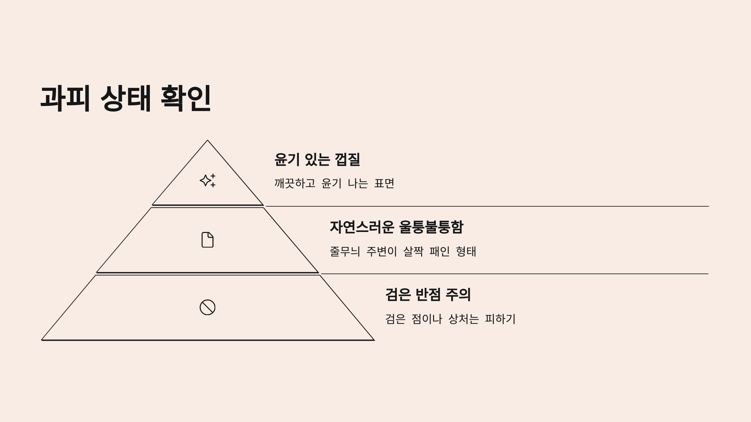 반면, 과피가 거칠거나 검은 반점이 많다면 오래되었거나 상처가 난 경우일 수 있어요.
