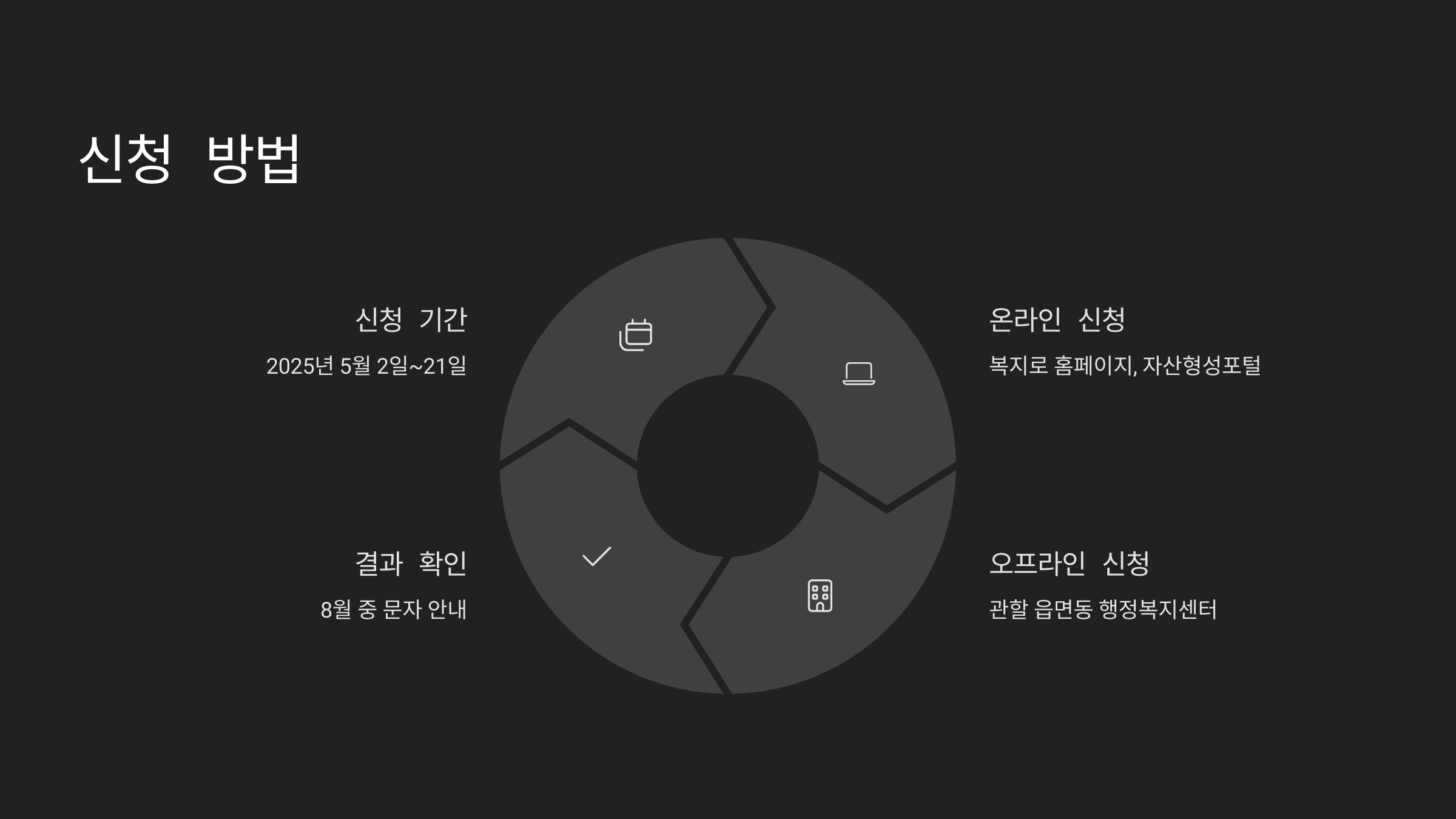 - 신청 후 소득 및 재산 조사를 거쳐 8월 중 개별 문자 메시지로 안내돼요.
