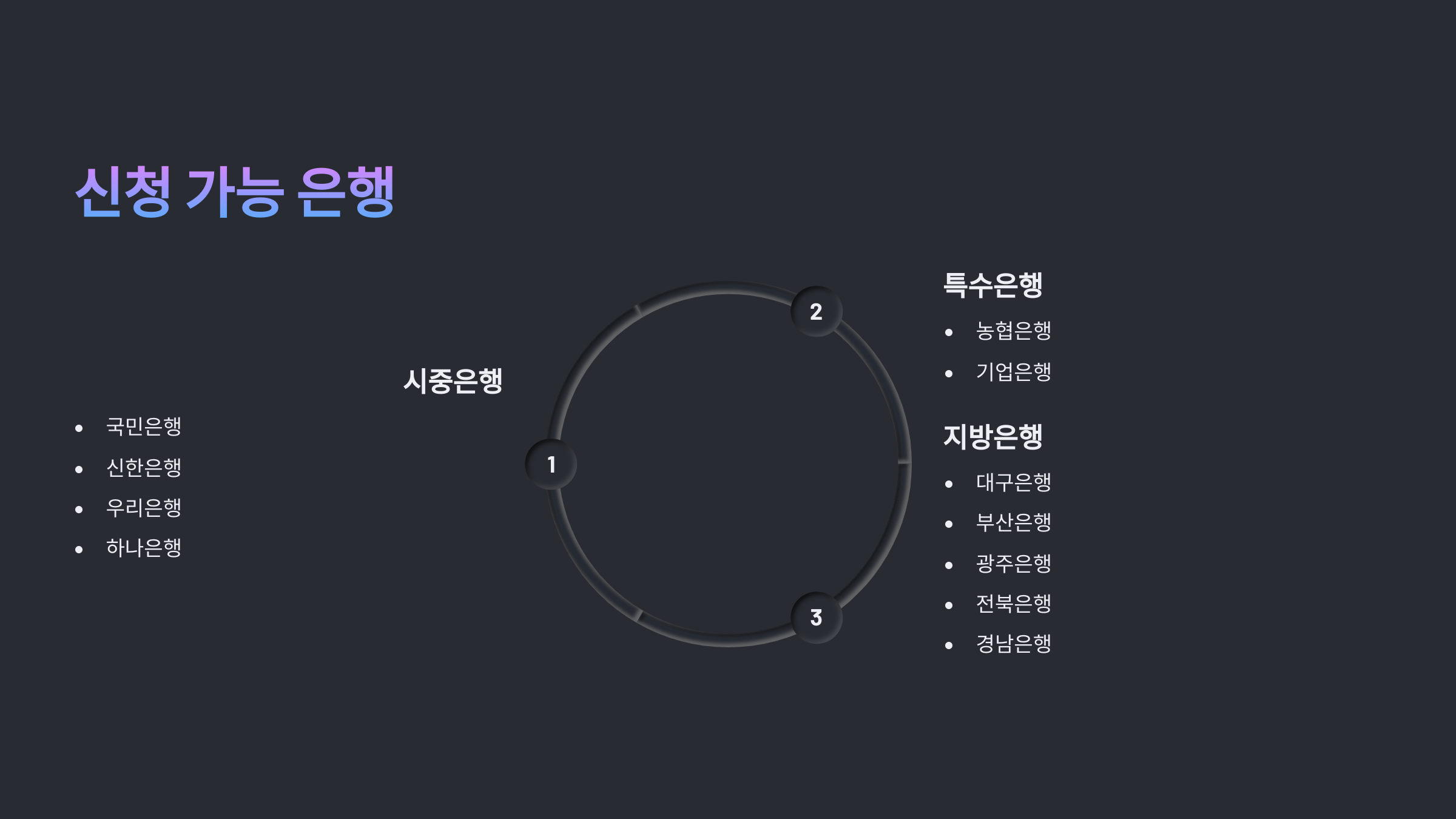 농협, 신한, 우리, 하나, 기업, 국민, 대구, 부산, 광주, 전북, 경남은행 앱에서 신청 가능하답니다.