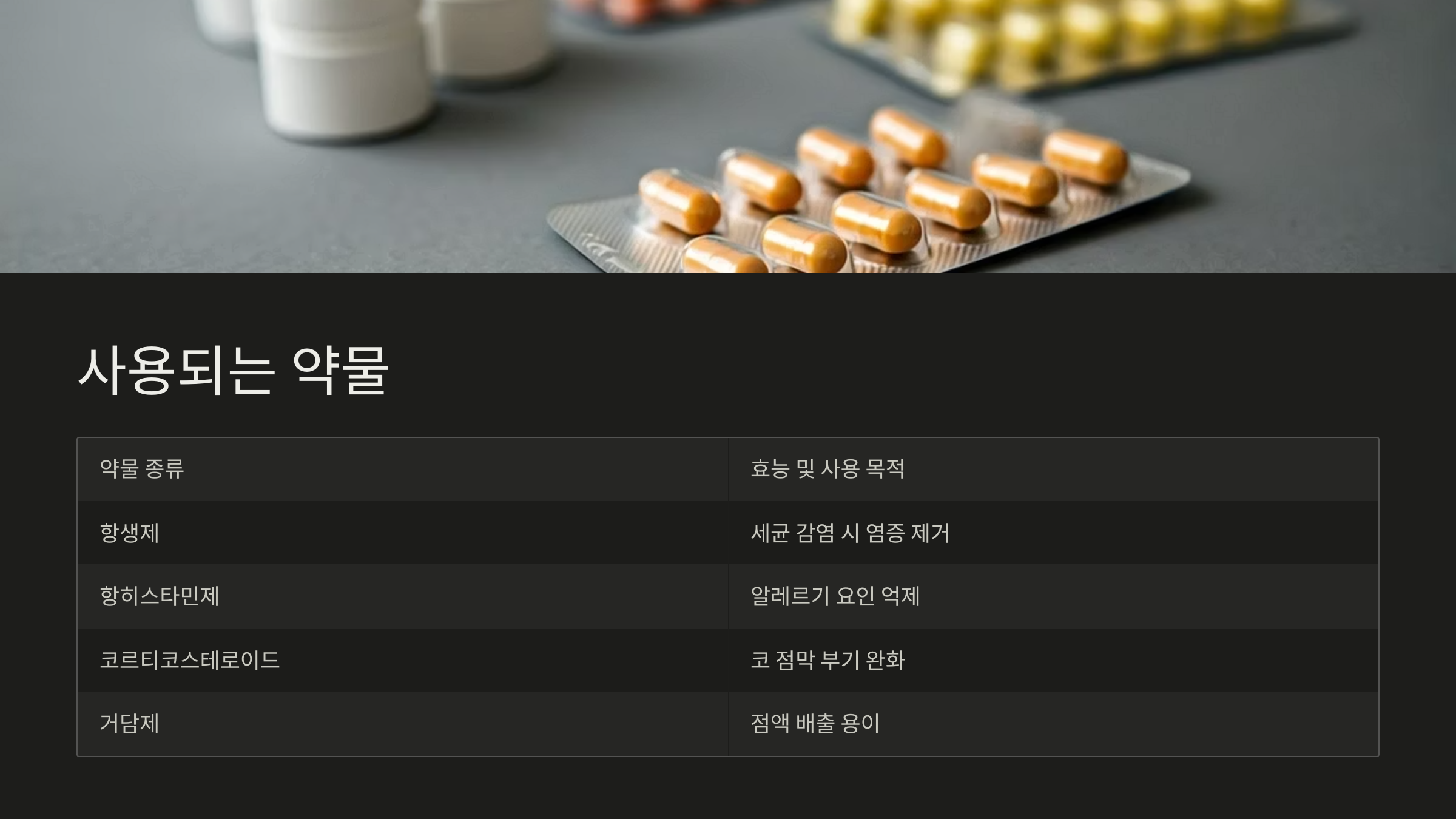 축농증의 치료는 원인균 제거, 염증 완화, 부비동 배출 개선을 목표로 진행됩니다.
