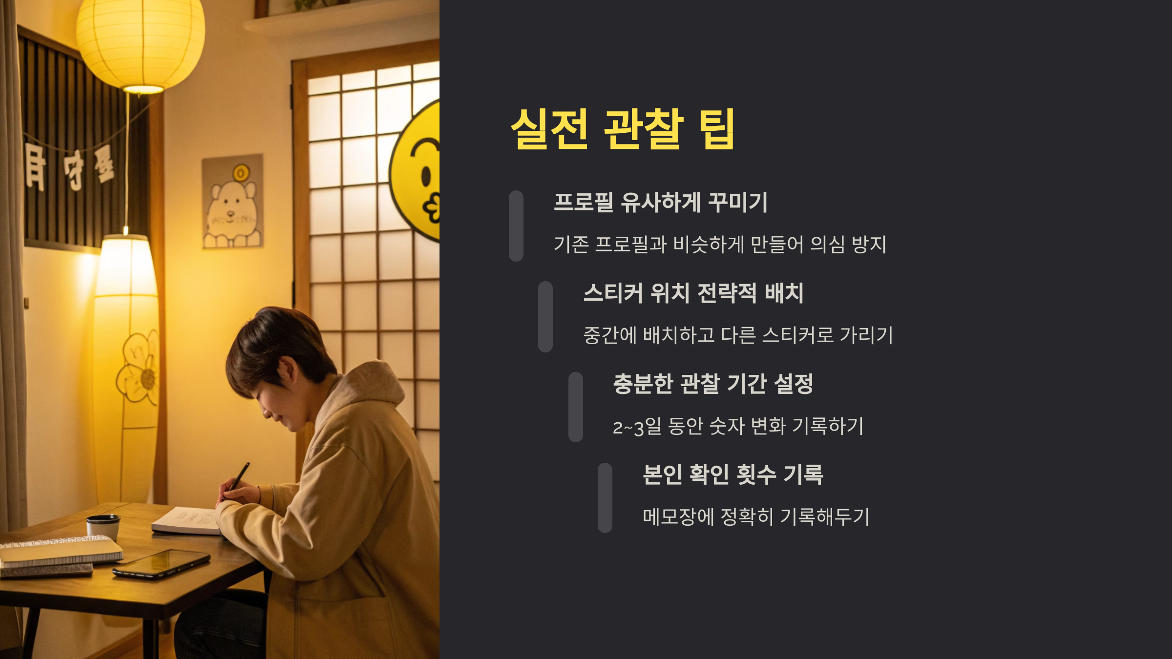 | 스티커 숨기기 | 음악 스티커 등으로 가려 의심 방지 |