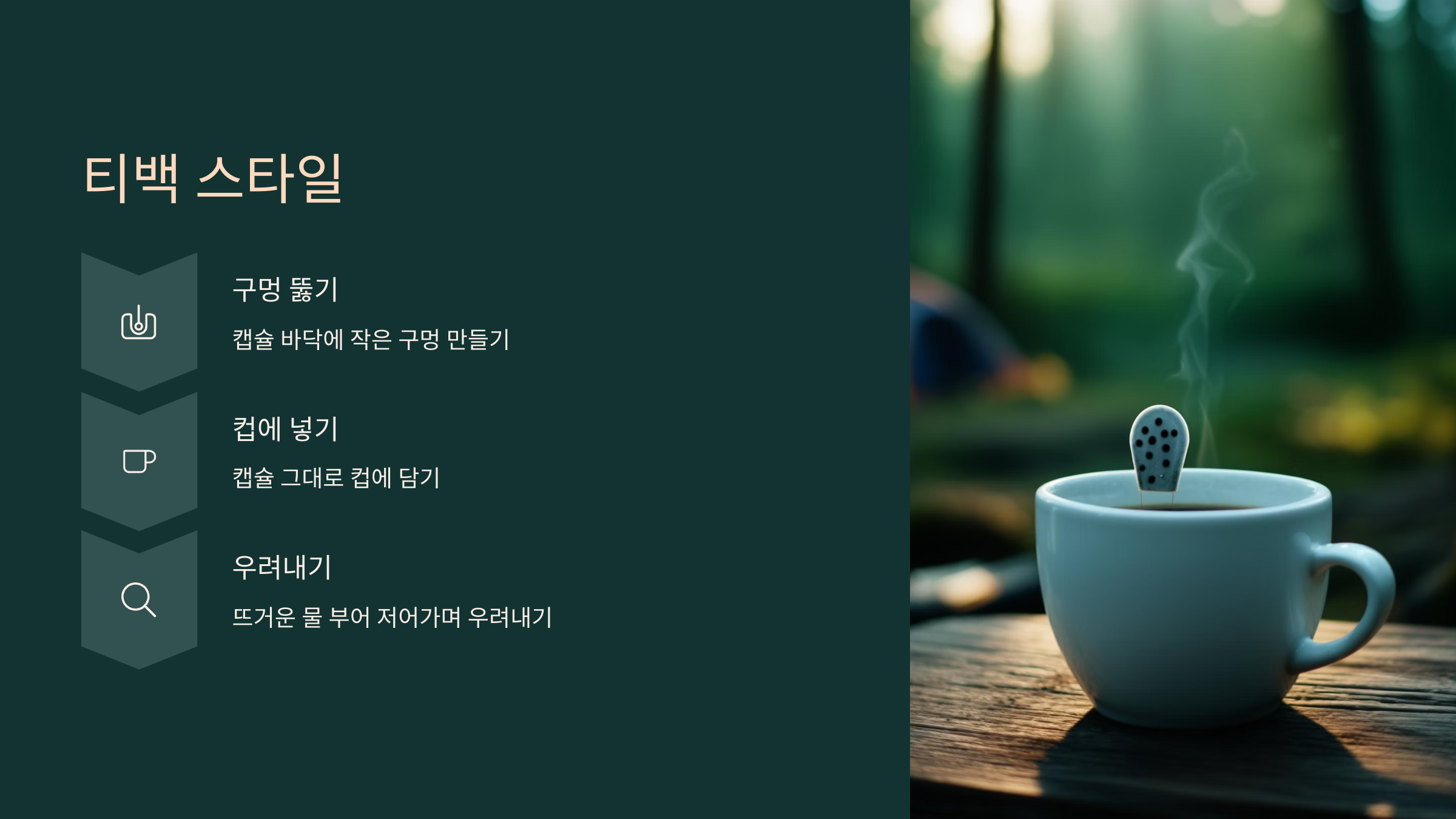 캡슐 바닥에 작은 구멍을 뚫고, 그대로 컵에 넣은 뒤 뜨거운 물을 부어주세요.