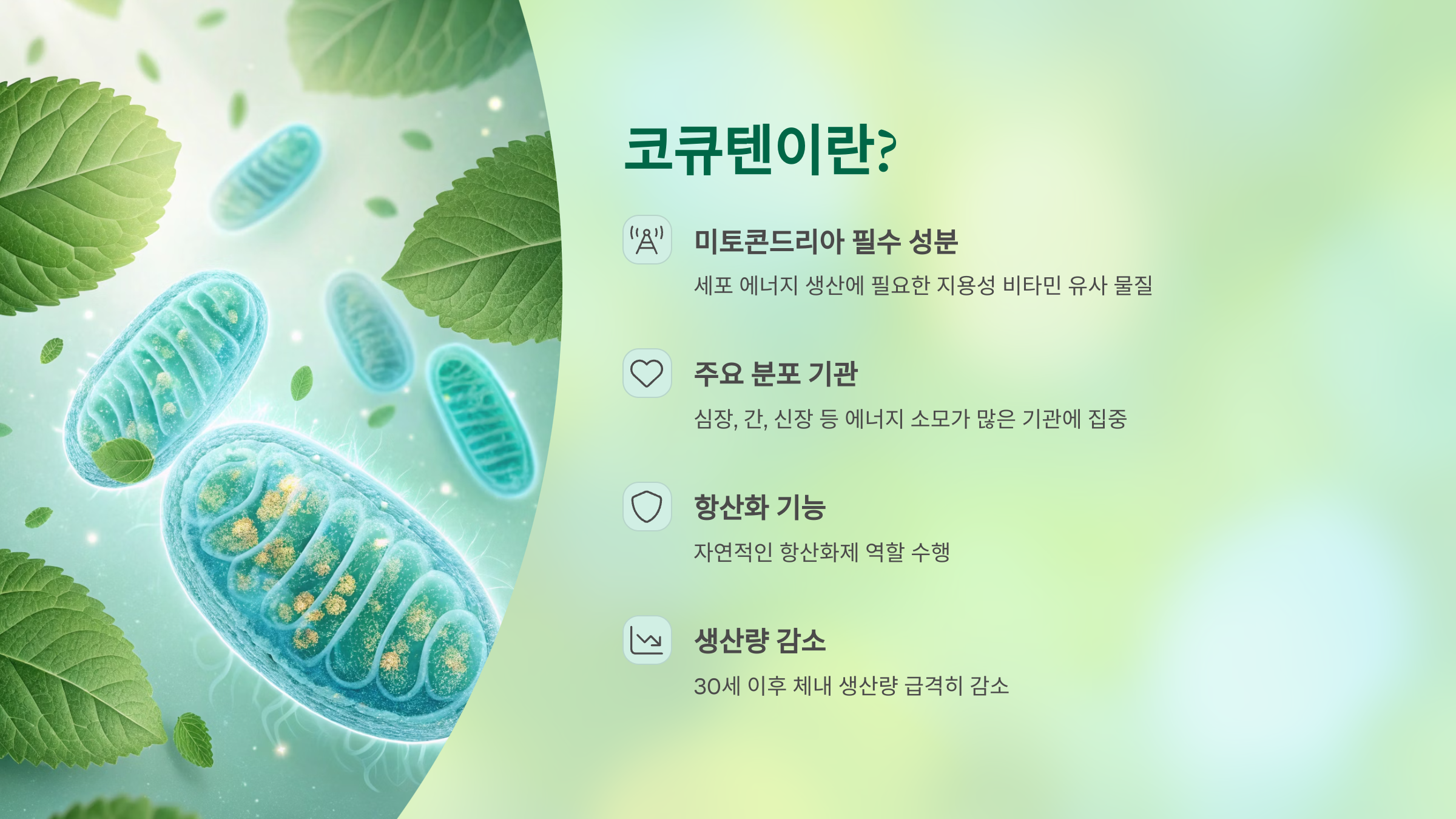오늘은 피로 해소부터 심장 건강, 항산화까지 다양하게 활용되는 코큐텐의 모든 것을 자세히 알려드릴게요!