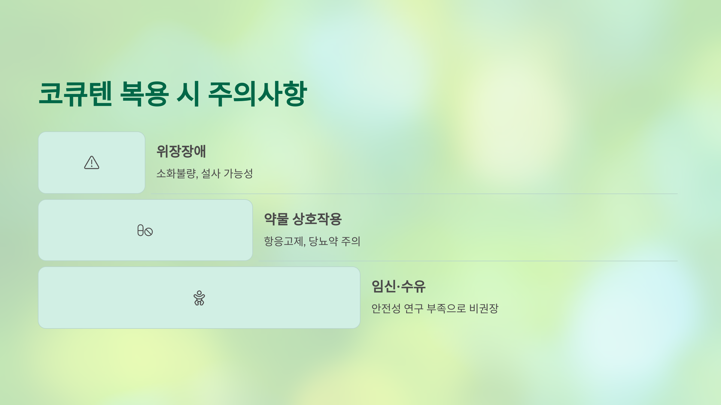 코큐텐은 대부분의 사람에게 안전한 영양소로 평가되고 있지만, 특정 상황에서는 주의가 필요합니다.