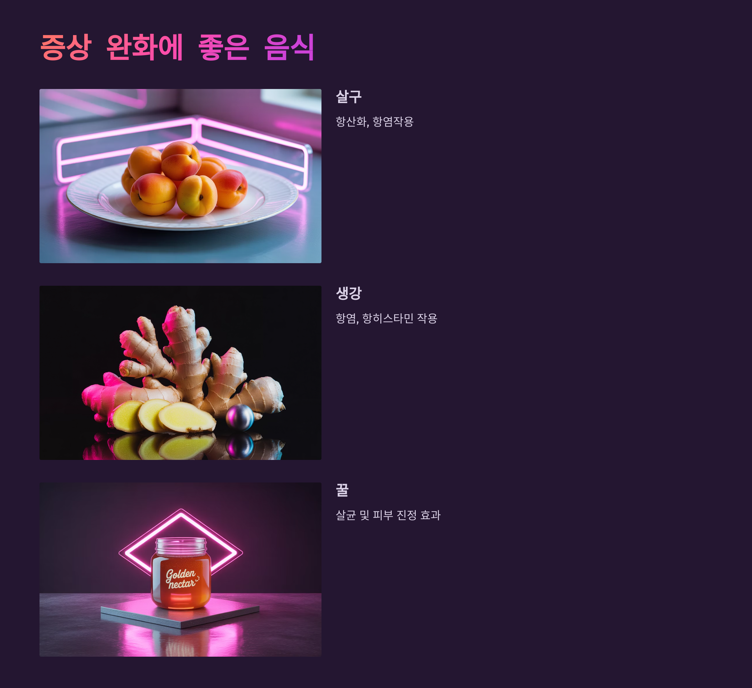| 생강 | 항염, 항히스타민 작용 |