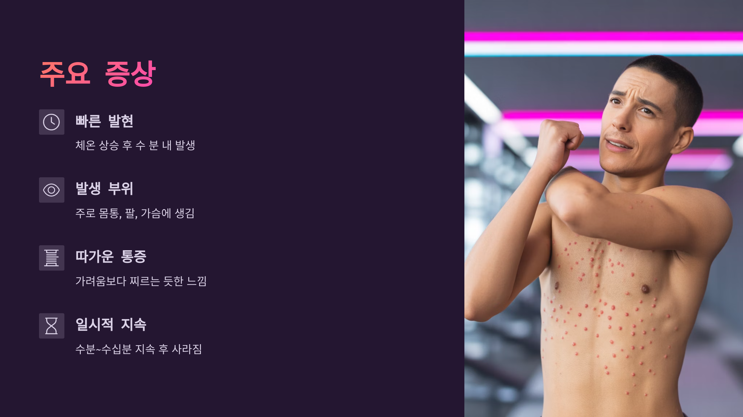 🔖 체온 상승 후 빠르게 나타남: 운동, 뜨거운 샤워, 긴장 후 수 분 내 발생