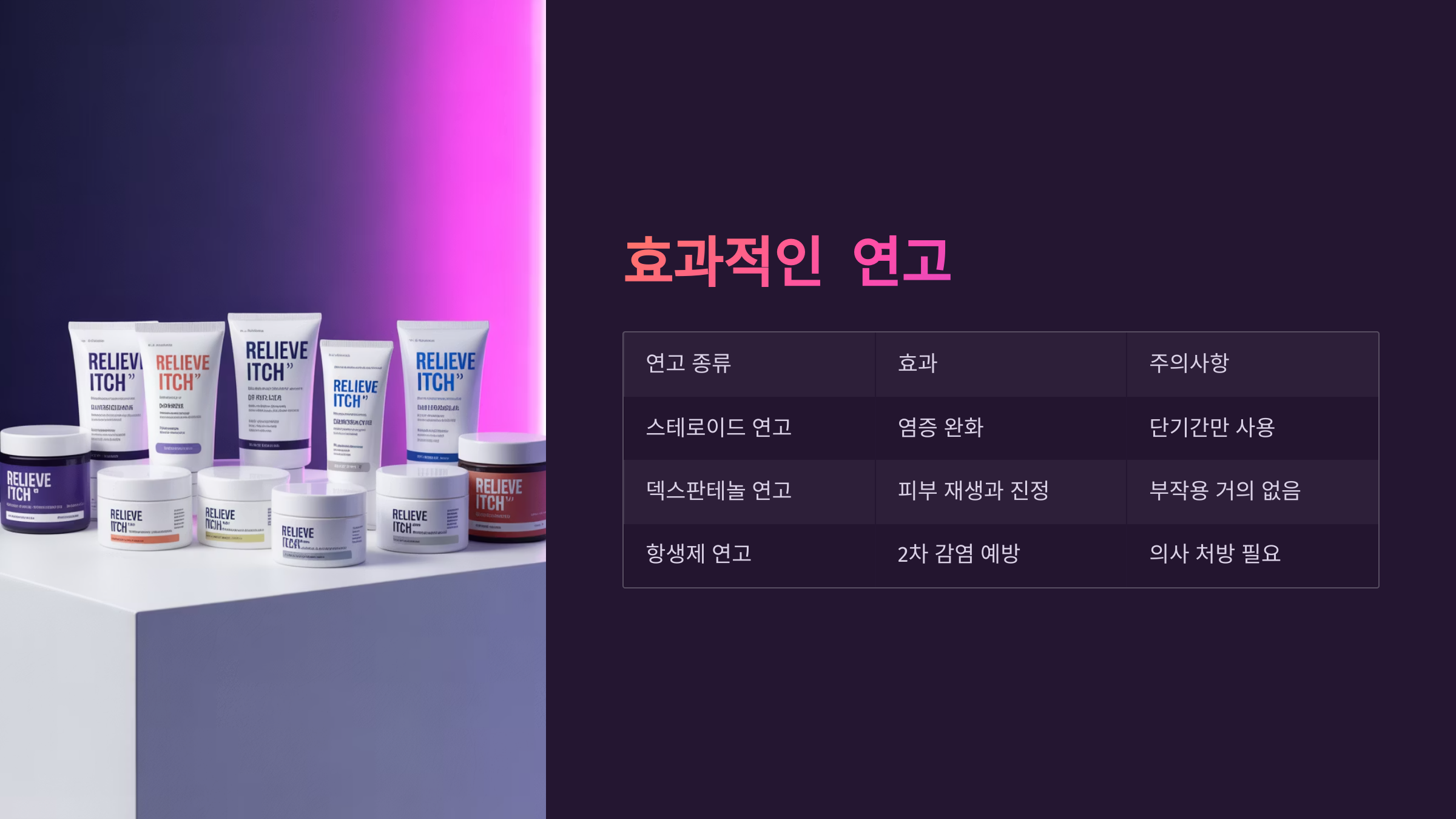 스테로이드 연고 | 의사 처방 하에 단기간 사용. 염증 완화에 효과적이나 장기 사용은 부작용 우려 |