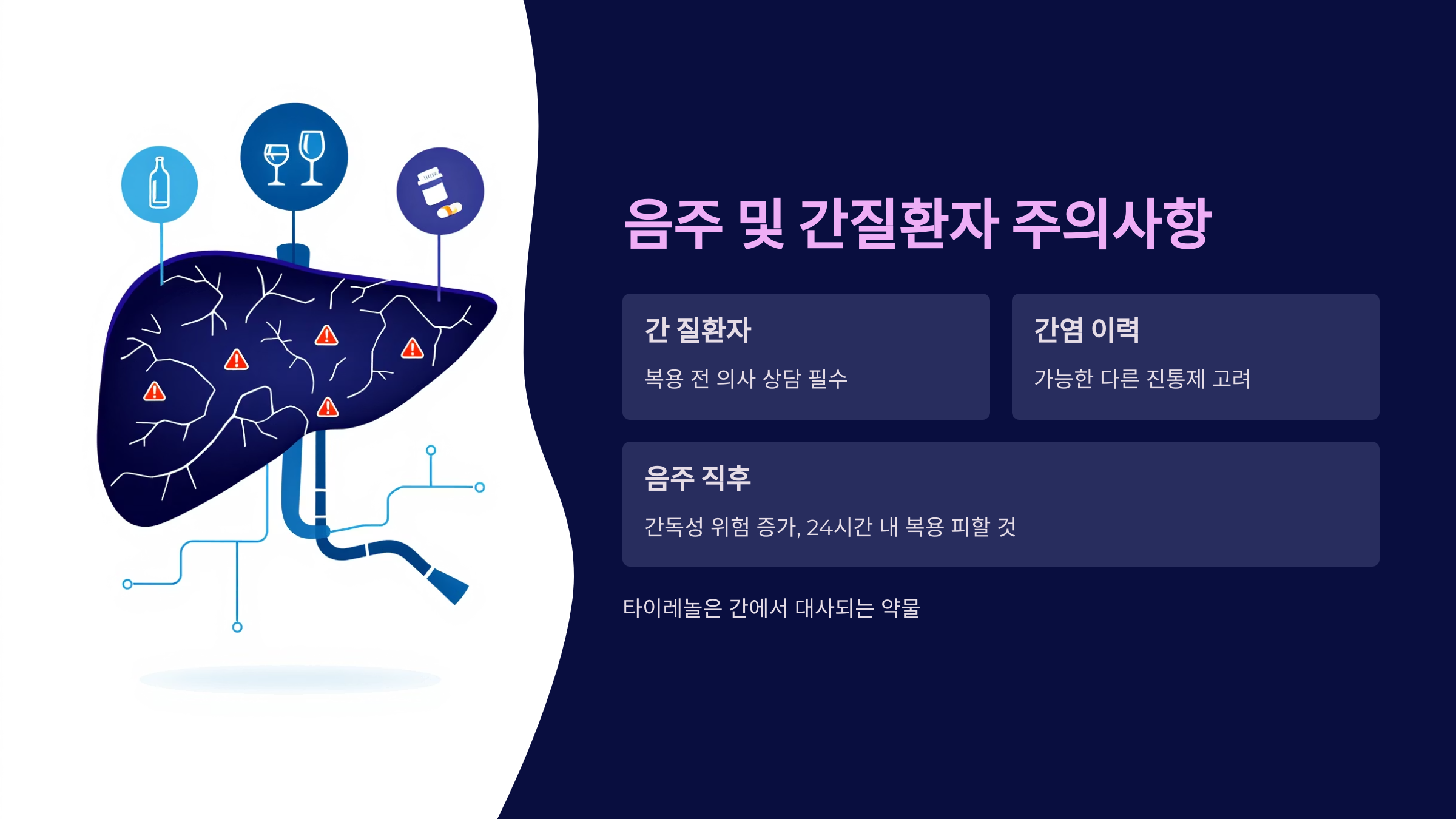 ⚠️ 주의: 음주 후 타이레놀 복용은 간 손상을 일으킬 수 있으므로 피하는 것이 가장 안전합니다.