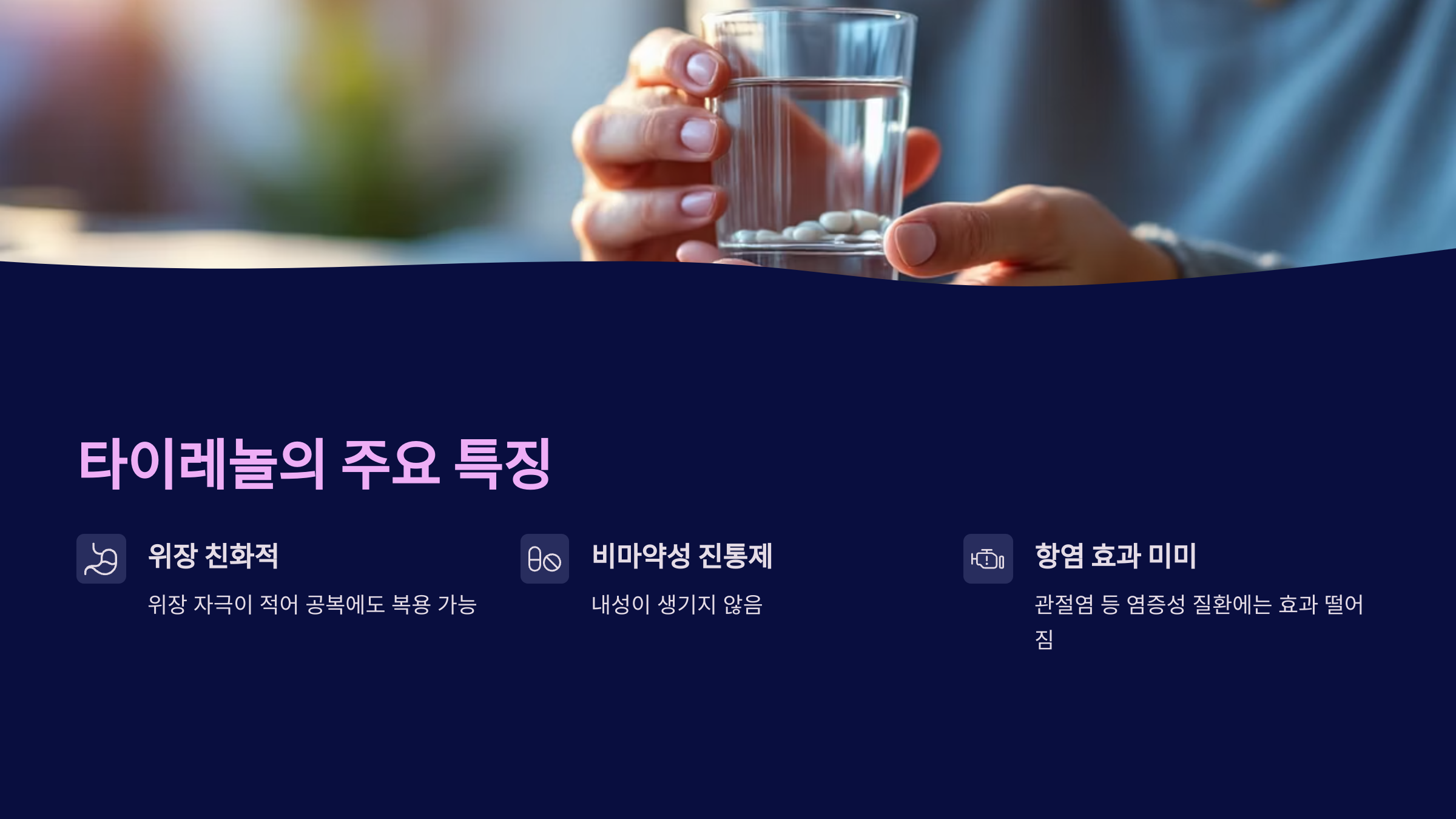💡 TIP: 타이레놀은 진통 작용은 있지만, 항염 효과는 거의 없기 때문에 관절염 등의 염증성 질환에는 효과가 떨어질 수 있어요.