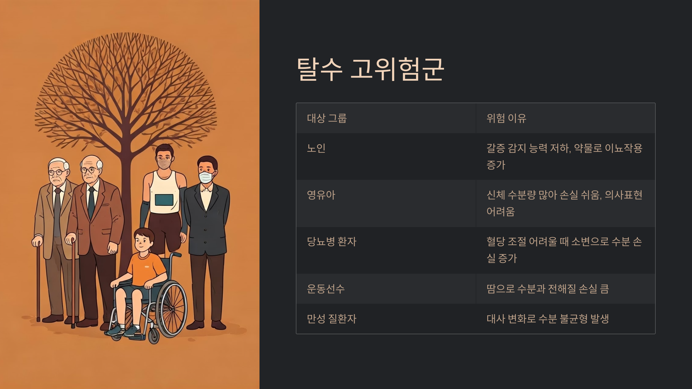 탈수는 누구에게나 발생할 수 있지만, 특정 그룹은 더 큰 위험에 노출되어 있어요.
