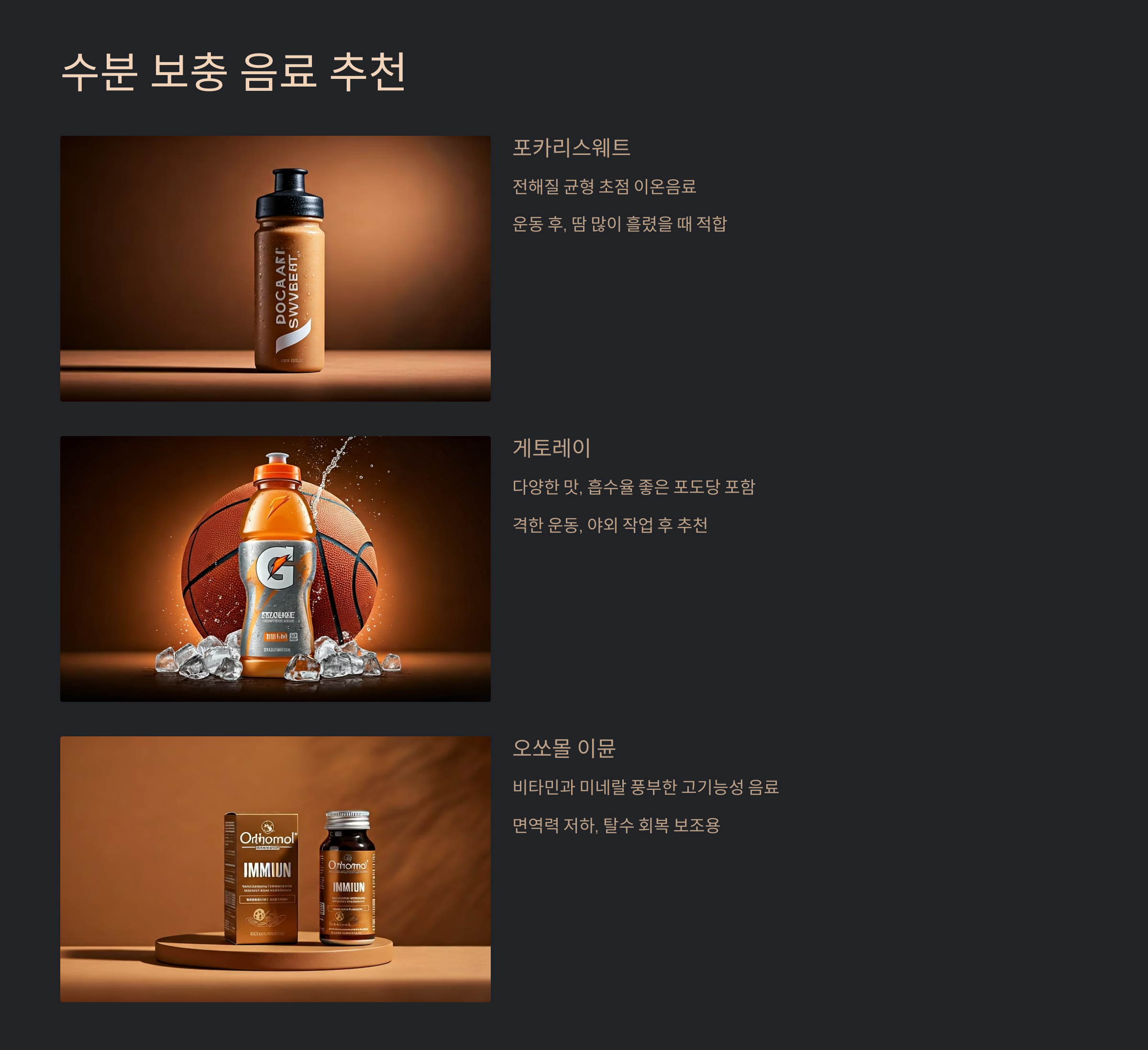 ⚠️ 주의: 커피, 술, 탄산음료 등 이뇨작용이 있는 음료는 오히려 탈수를 악화시킬 수 있어요.