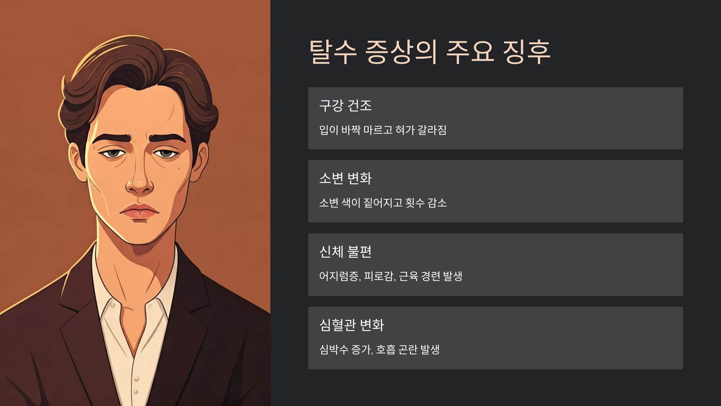 그게 바로 '탈수 증상'일 수 있습니다. 일상 속에서 흔히 겪을 수 있지만, 가볍게 넘겼다간 큰일로 이어질 수 있는 증상이죠.