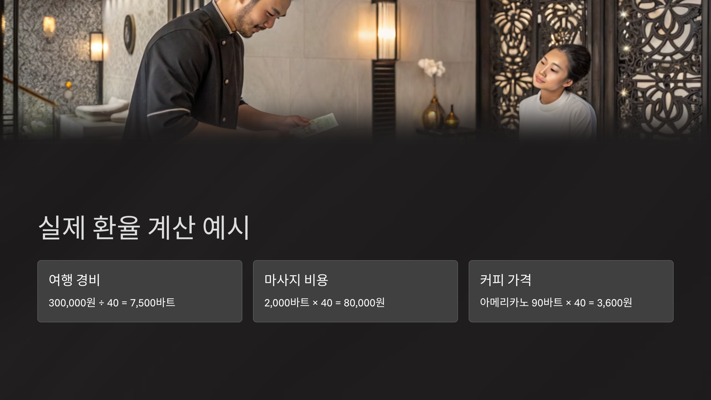 💬 바트 환율이 38~42원 사이에서 움직이고 있기 때문에, 여유 있게 40원으로 잡는 게 편하고 안전해요.