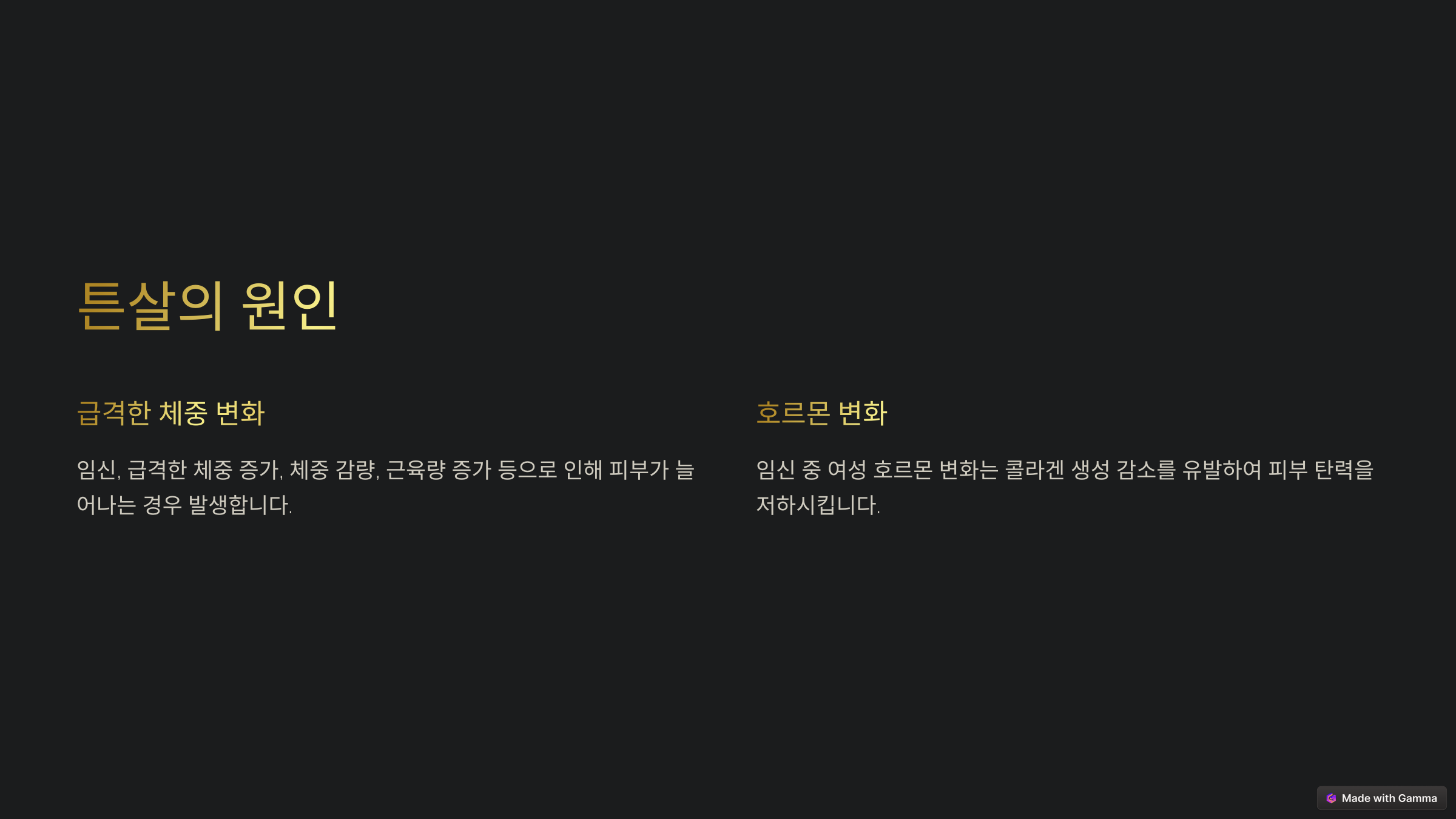 튼살은 피부의 진피층이 급격하게 늘어나거나 줄어들면서 콜라겐과 엘라스틴 섬유가 손상되면서 발생합니다. 주된 원인은 다음과 같습니다: