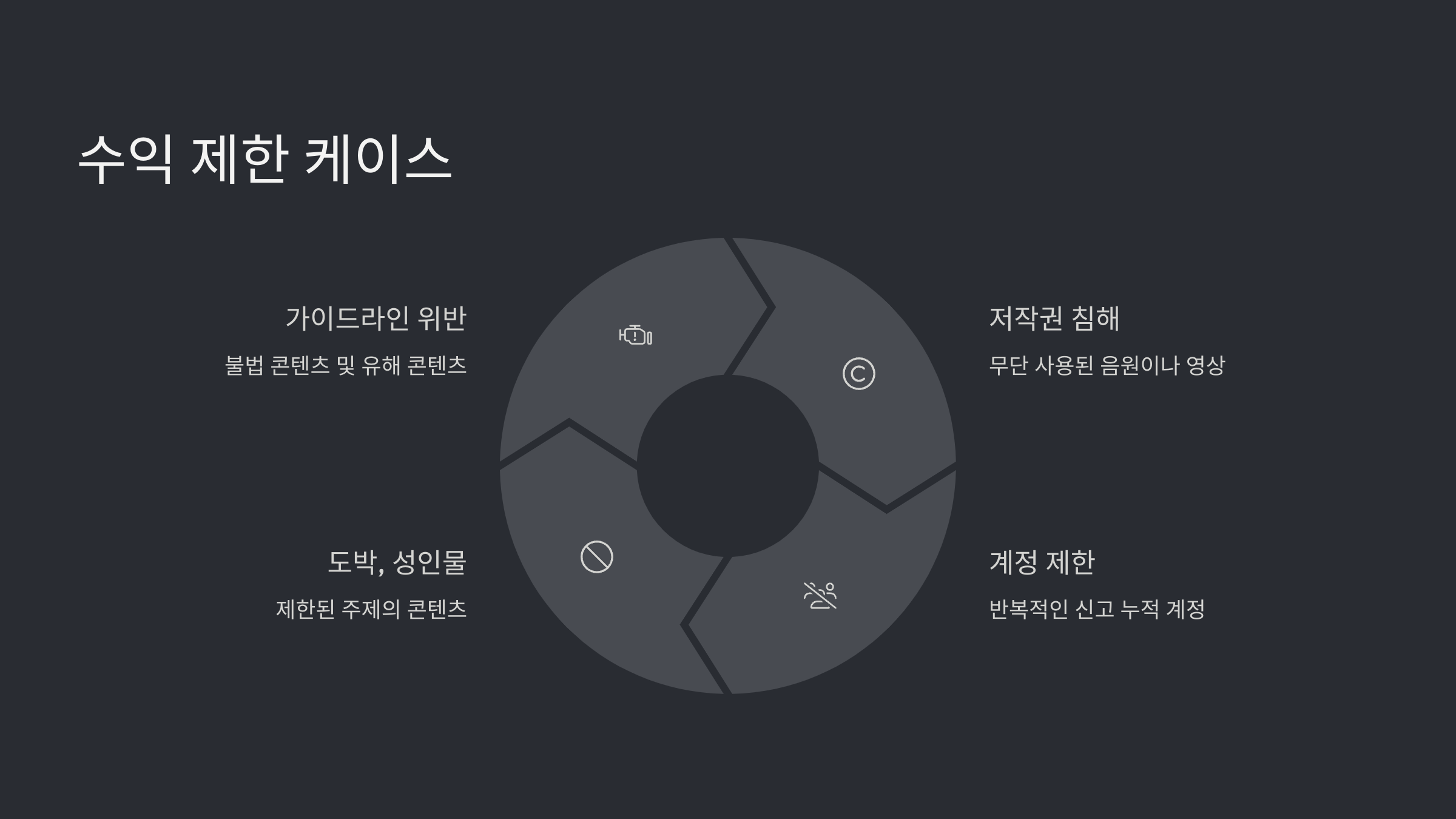 틱톡에서 수익 조건을 모두 만족했더라도, 아래와 같은 사유가 있다면 수익이 제한될 수 있어요.