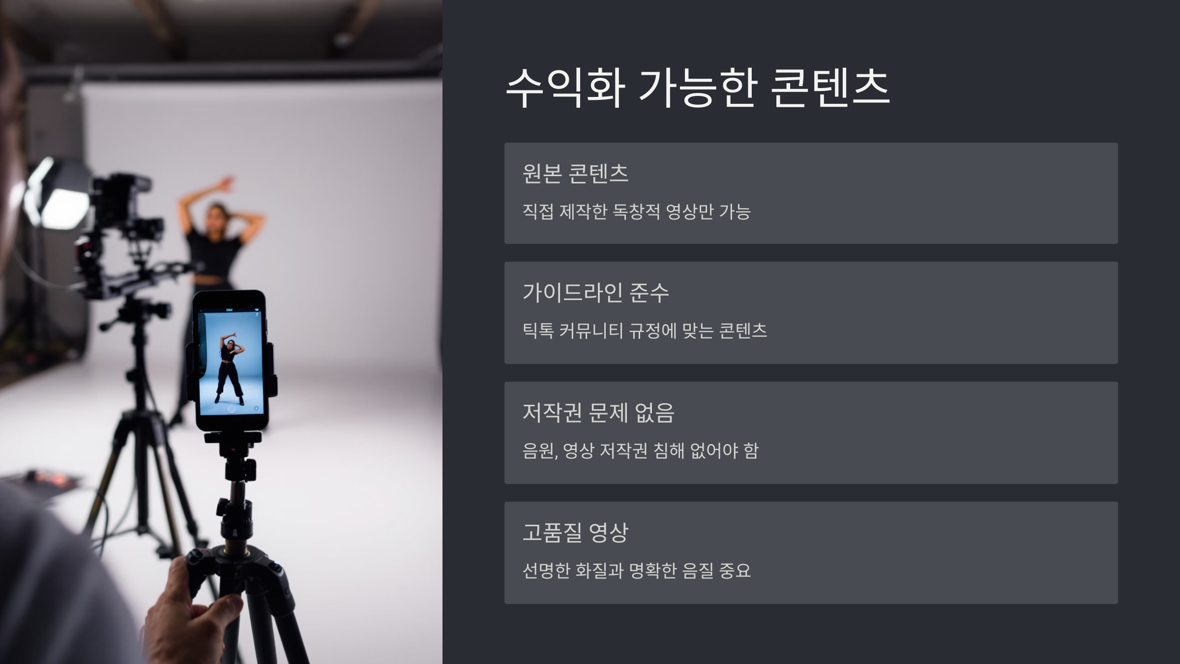 틱톡은 창의성과 진정성을 중요하게 생각해요. 내가 직접 기획하고 제작한 콘텐츠일수록 수익화 가능성이 높아진답니다.