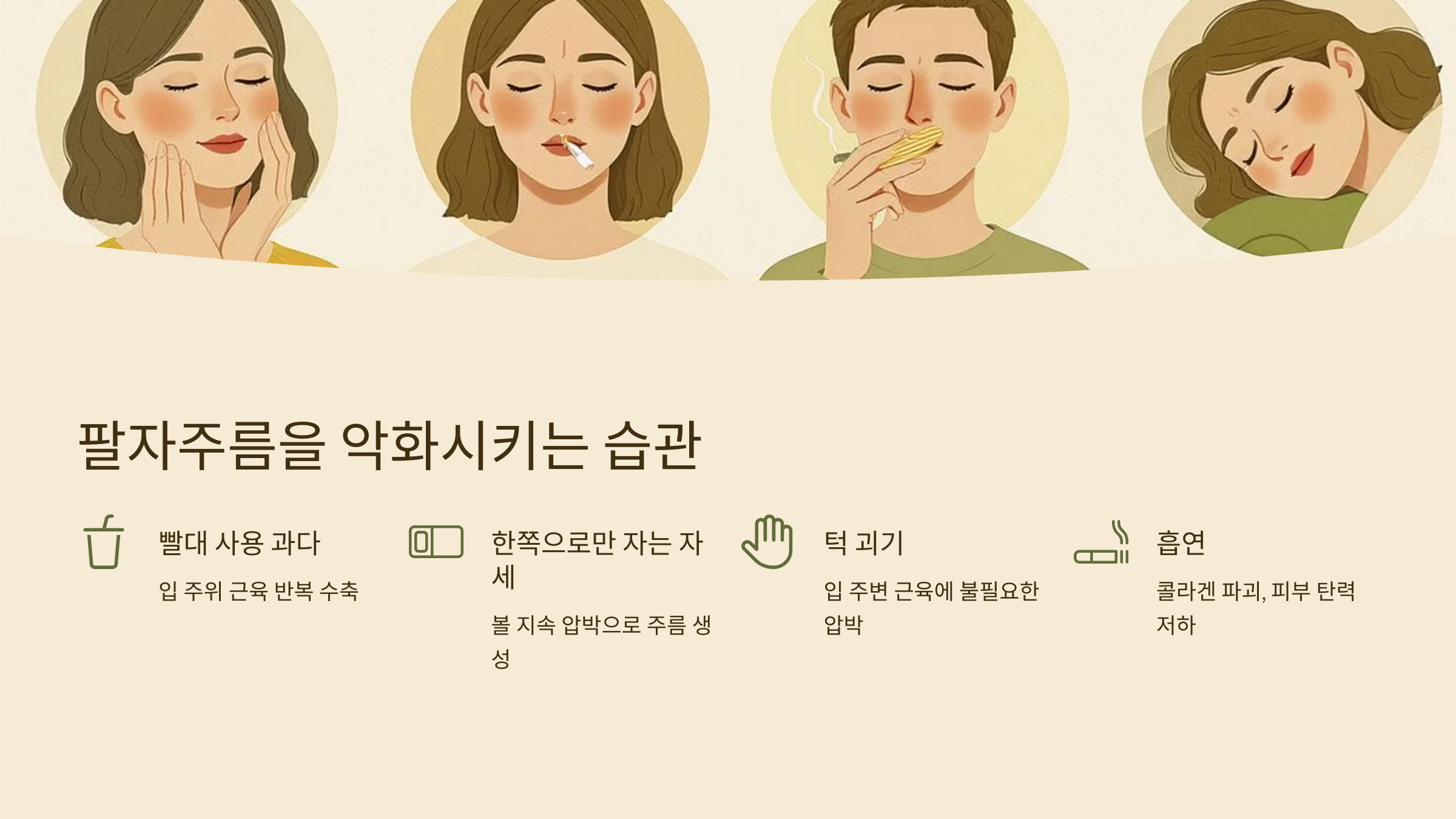 무심코 반복하는 습관들이 팔자주름을 깊게 만들 수 있습니다. 아래 습관들은 꼭 피해주세요!