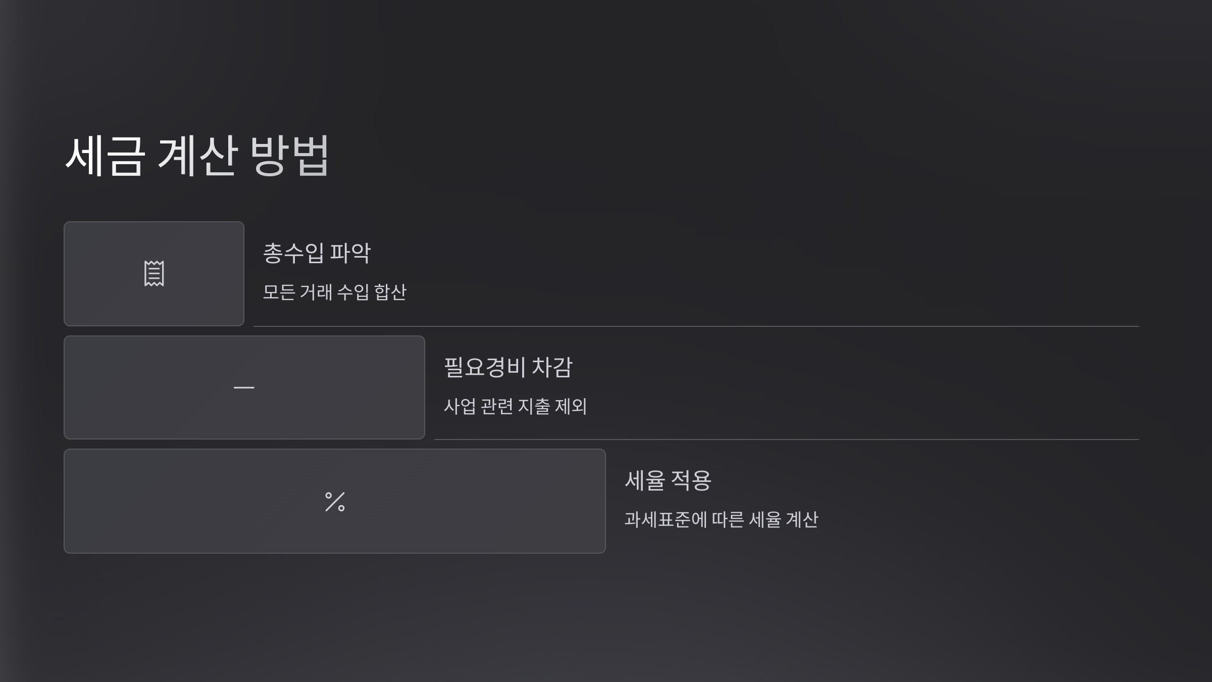 종합소득세는 ‘1년간 받은 총수입 - 필요경비 - 각종 공제’로 계산됩니다.