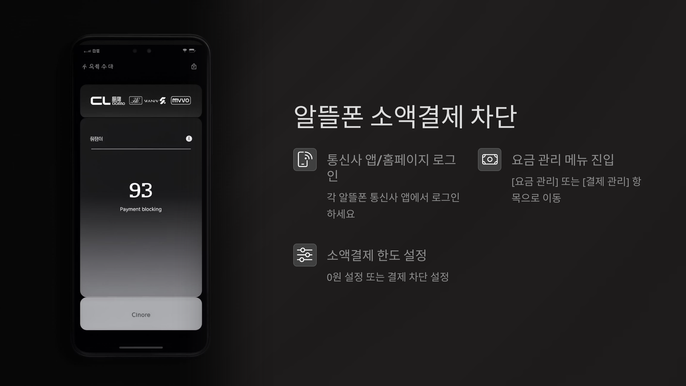 각 통신사 앱 또는 홈페이지에서 소액결제 한도를 0원으로 설정하면 완전히 차단됩니다.