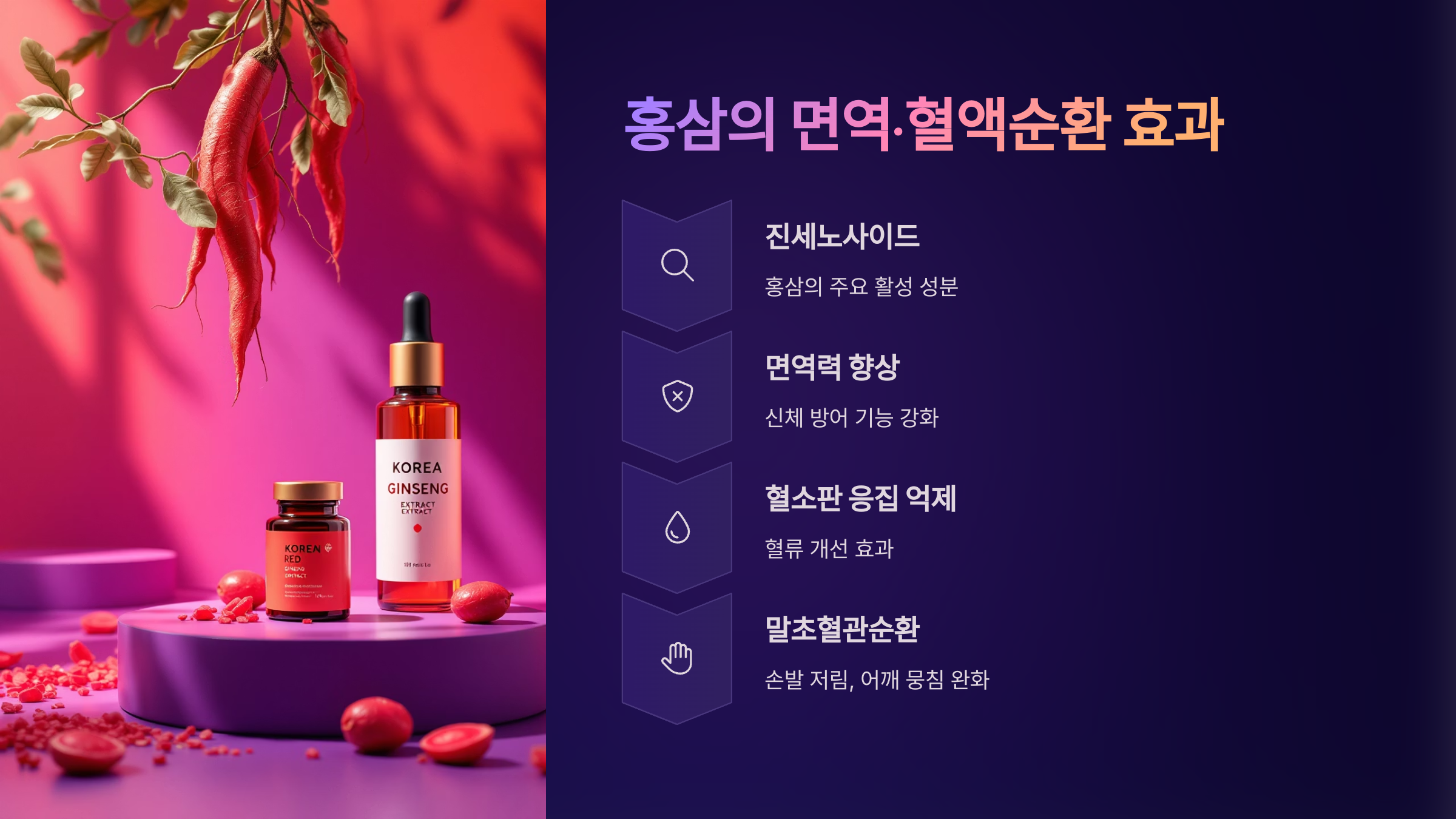 주요 성분인 진세노사이드(Ginsenoside)는 피로 회복, 면역력 향상, 혈액순환 개선에 폭넓은 효과를 보여주죠.