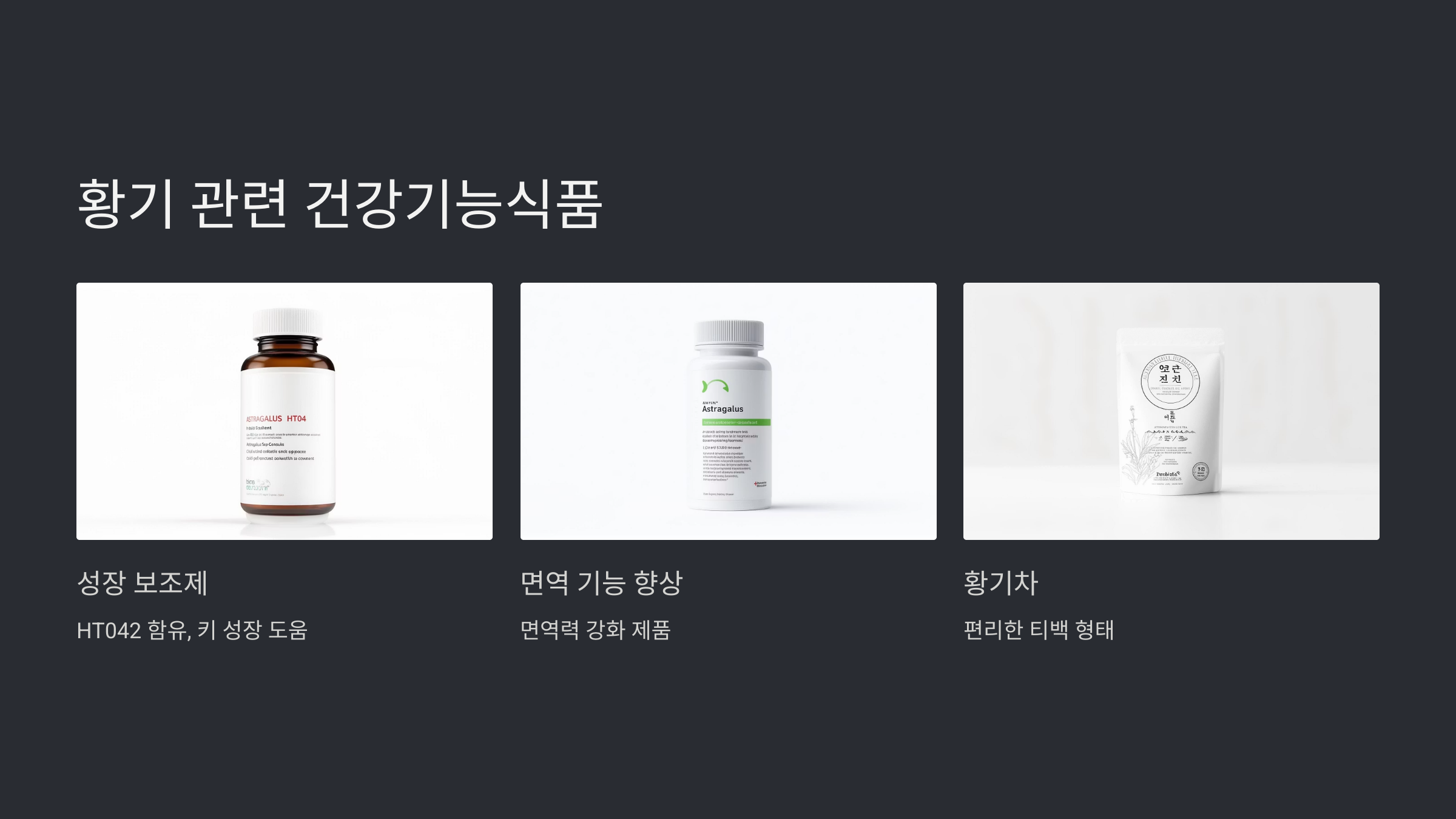 최근에는 HT042 복합물을 활용한 황기 건강기능식품도 다양하게 출시되고 있어요.