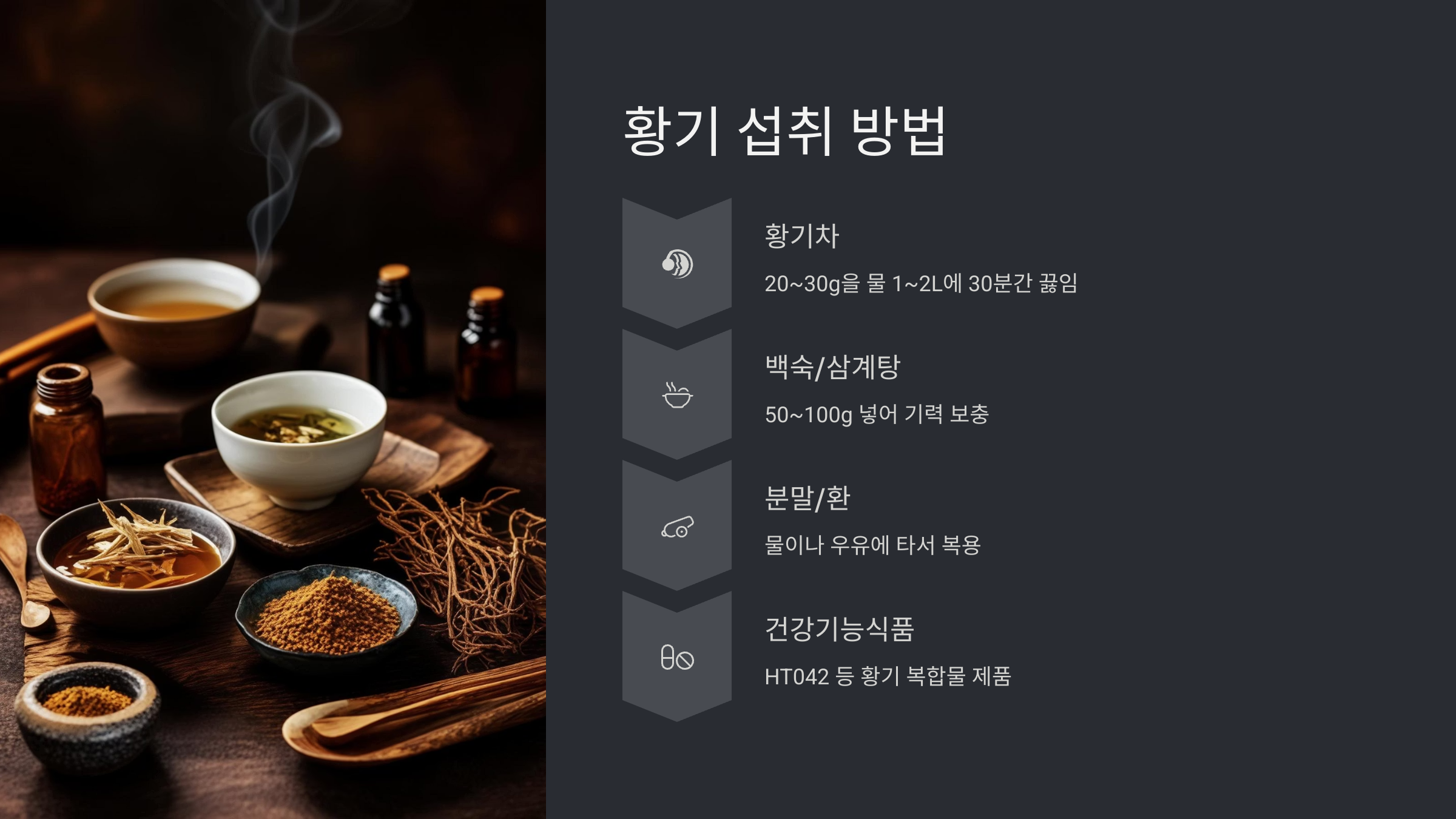 황기는 다양한 방법으로 섭취할 수 있어요. 본인에게 맞는 방식으로 시도해보세요!